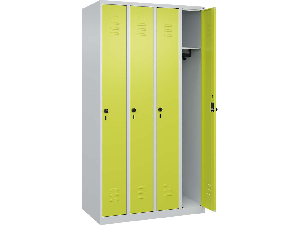 Die vier Abteile des Spinds haben jeweils eine Breite von 250 mm und eignen sich, um persönliche Gegenstände sicher zu verwahren. Der Spind besteht aus einer stabilen Stahlkonstruktion mit hochwertiger Einbrennbeschichtung, die für eine hohe UV- und Korrosionsbeständigkeit sorgt. Jedes Abteil ist mit einem Ablageboden sowie einer stabilen Garderobenstange ausgestattet, an der sich drei verdrehsichere Doppel-Schiebehaken befinden. Für eine gute Luftzirkulation sorgen die Belüftungsöffnungen an der Rückseite. Die rechts angeschlagenen Stahl-Türen lassen sich bis zu 110 Grad öffnen und bieten und geschlossenen Seitenprofilen hohe Stabilität. Zusätzlich schützen Bodengleiter sowohl den Schrank als auch den Boden. Vier ergonomische Sicherheits-Drehriegel ermöglichen den Einsatz von Vorhängeschlössern und bieten hohe Sicherheit. B 100 x T 50 x H 185 cm.
