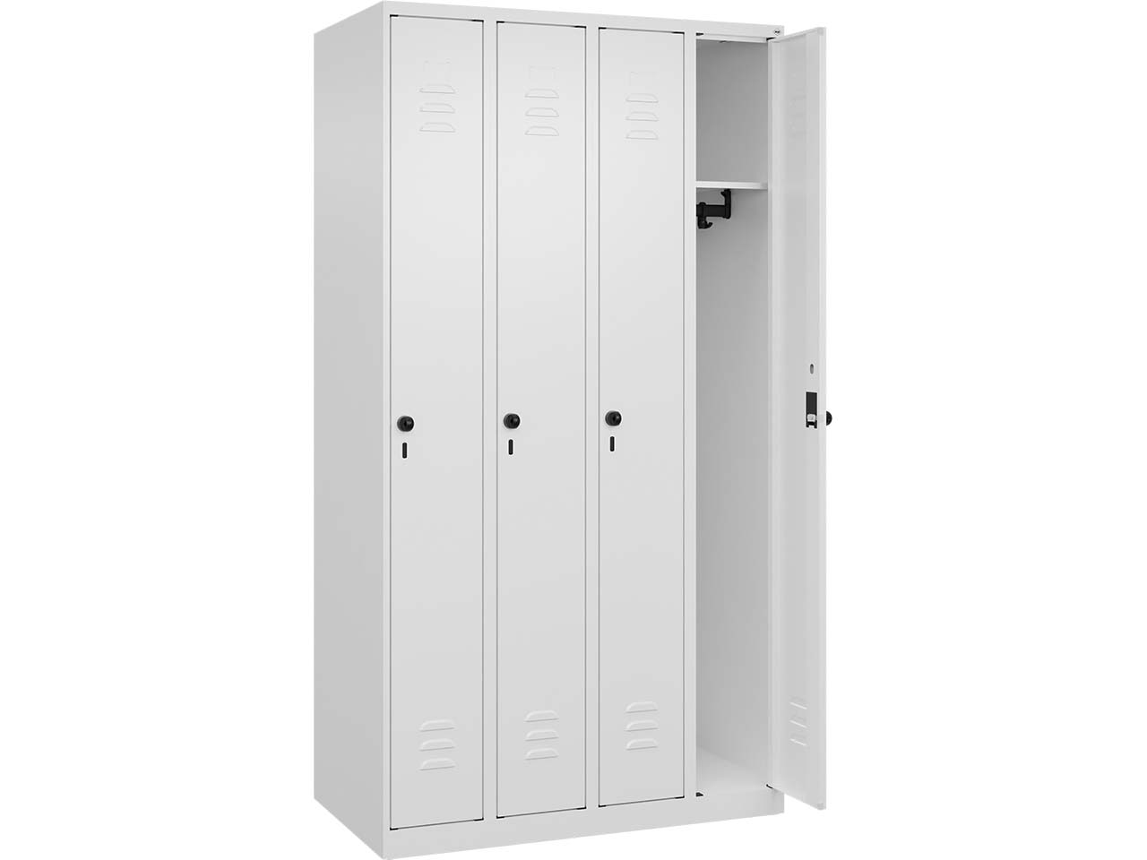Die vier Abteile des Spinds haben jeweils eine Breite von 250 mm und eignen sich, um persönliche Gegenstände sicher zu verwahren. Der Spind besteht aus einer stabilen Stahlkonstruktion mit hochwertiger Einbrennbeschichtung, die für eine hohe UV- und Korrosionsbeständigkeit sorgt. Jedes Abteil ist mit einem Ablageboden sowie einer stabilen Garderobenstange ausgestattet, an der sich drei verdrehsichere Doppel-Schiebehaken befinden. Für eine gute Luftzirkulation sorgen die Belüftungsöffnungen an der Rückseite. Die rechts angeschlagenen Stahl-Türen lassen sich bis zu 110 Grad öffnen und bieten und geschlossenen Seitenprofilen hohe Stabilität. Zusätzlich schützen Bodengleiter sowohl den Schrank als auch den Boden. Vier ergonomische Sicherheits-Drehriegel ermöglichen den Einsatz von Vorhängeschlössern und bieten hohe Sicherheit. B 100 x T 50 x H 185 cm.