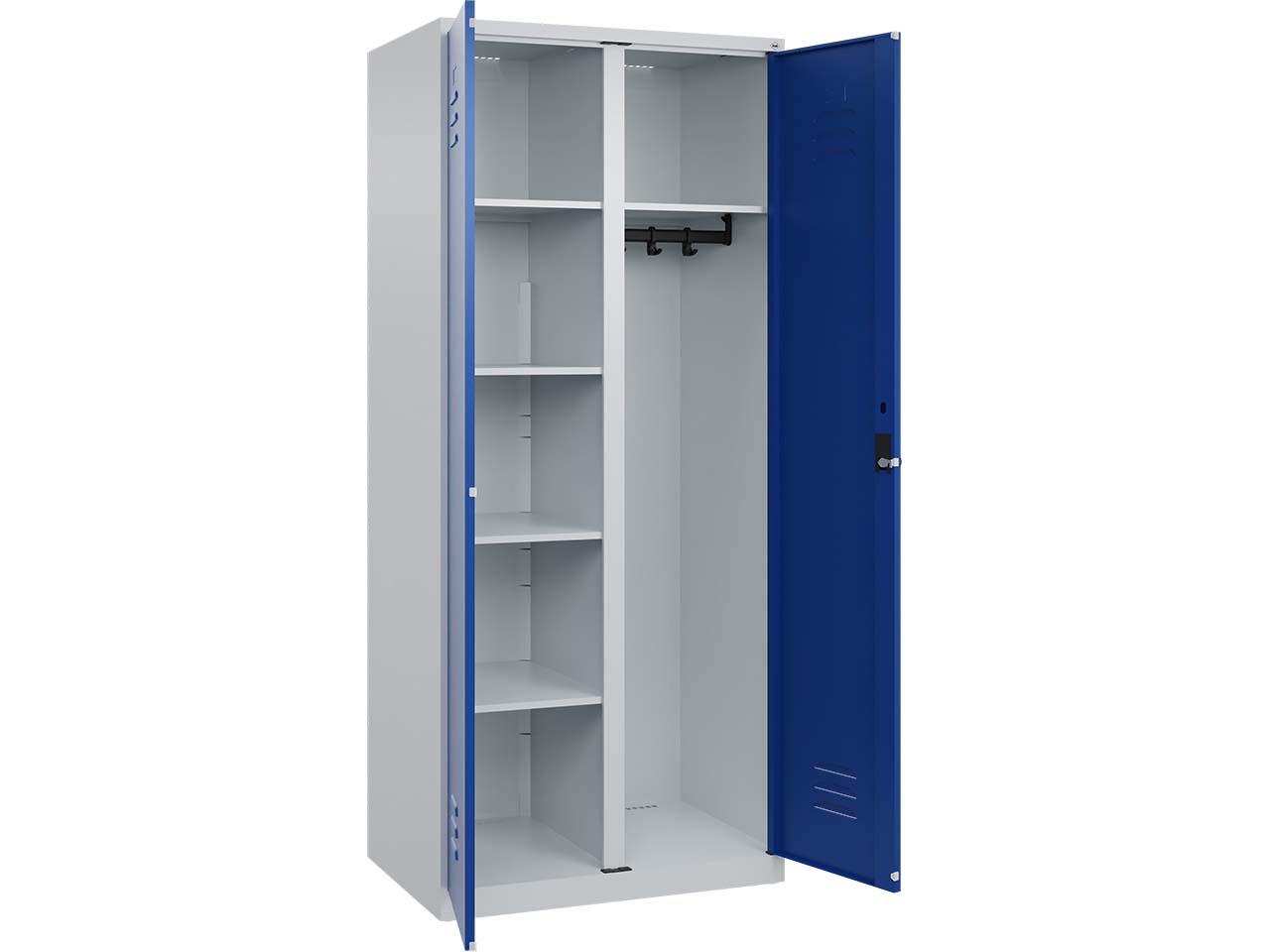 Der Wäsche- und Garderobenspind bietet eine durchdachte und stilvolle Lösung für die Aufbewahrung persönlicher Gegenstände. Mit zwei Abteilen und einer großzügigen Abteilbreite von 400 mm steht viel Stauraum zur Verfügung. Der robuste Korpus aus Stahl ist dank hochwertiger Einbrennbeschichtung UV- und korrosionsbeständig. Belüftungsöffnungen oben und unten garantieren eine optimale Luftzirkulation. Im linken Abteil befinden sich vier Fachböden, während das rechte Abteil eine stabile Garderobenstange mit vier verdrehsicheren Doppel-Schiebehaken bietet. Der ergonomische Sicherheits-Drehriegel ermöglicht die Nutzung eines Vorhängeschlosses. B 80 x T 50 x H 185 cm.
