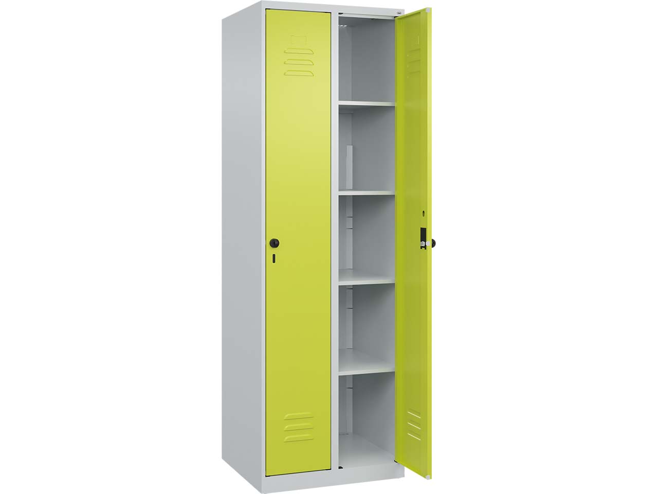 Der Wäsche-Spind mit zwei Abteilen vereint Funktionalität, Stabilität und Langlebigkeit in einem ansprechenden Design. Er eignet sich hervorragend für die Nutzung in Umkleideräume, Pausenräumen oder öffentlichen Einrichtungen und bietet Platz für die sichere Aufbewahrung von Wäsche und Wertgegenständen. Der UV- und korrosionsbeständige Korpus aus Stahl gewährleistet hochwertige, langlebige Qualität. Für eine optimale Belüftung sind hinten Belüftungsöffnungen im oberen und unteren Bereich angebracht. Jedes Abteil ist mit vier praktischen Fachböden ausgestattet, die eine übersichtliche und geordnete Lagerung ermöglichen. Die Türen des Spinds verfügen über eine Soft-Anschlag-Funktion. Zur Sicherung der Abteile sind zwei ergonomische Sicherheits-Drehriegel vorhanden, die für die Verwendung mit Vorhängeschlössern vorgesehen sind. B 60 x T 50 x H 185 cm.