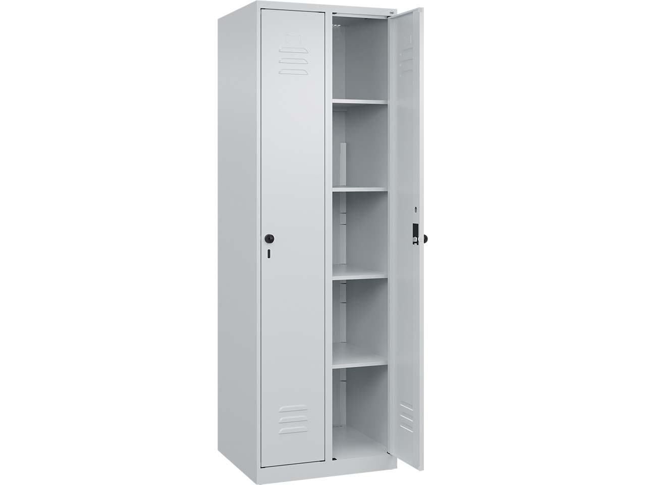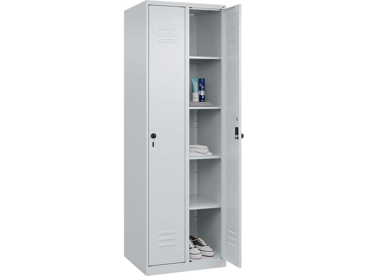 Der Wäsche-Spind mit zwei Abteilen vereint Funktionalität, Stabilität und Langlebigkeit in einem ansprechenden Design. Er eignet sich hervorragend für die Nutzung in Umkleideräume, Pausenräumen oder öffentlichen Einrichtungen und bietet Platz für die sichere Aufbewahrung von Wäsche und Wertgegenständen. Der UV- und korrosionsbeständige Korpus aus Stahl gewährleistet hochwertige, langlebige Qualität. Für eine optimale Belüftung sind hinten Belüftungsöffnungen im oberen und unteren Bereich angebracht. Jedes Abteil ist mit vier praktischen Fachböden ausgestattet, die eine übersichtliche und geordnete Lagerung ermöglichen. Die Türen des Spinds verfügen über eine Soft-Anschlag-Funktion. Zur Sicherung der Abteile sind zwei ergonomische Sicherheits-Drehriegel vorhanden, die für die Verwendung mit Vorhängeschlössern vorgesehen sind. B 60 x T 50 x H 185 cm.