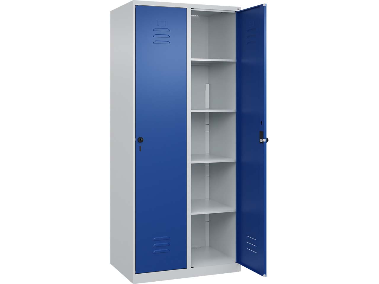 Der stabile, langlebige Wäsche-Spind mit zwei Abteilen ist ideal, um Kleidung und mehr sicher aufzubewahren. Der Korpus besteht aus einer robusten Stahlkonstruktion mit hochwertiger Einbrennbeschichtung, die UV- und korrosionsbeständig ist. Jedes Abteil ist mit vier Fachböden ausgestattet und die Belüftungsöffnungen an der Rückseite sorgen für eine optimale Luftzirkulation. Die Türen lassen sich bis zu 110 Grad öffnen und sind mit Soft-Anschlag sowie geschlossenen Seitenprofilen für hohe Stabilität versehen. Bodengleiter schützen den Schrank und den Boden, während Lüftungsschlitze und ein Etikettenrahmen die Funktionalität erhöhen. Zwei ergonomische Sicherheits-Drehriegel ermöglichen die Verwendung von Vorhängeschlössern. B 80 x T 50 x H 185 cm.