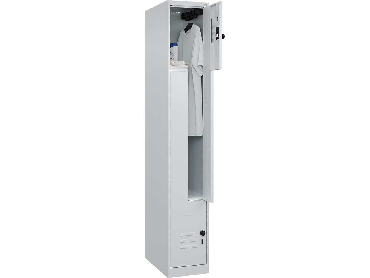 Der Spind verfügt über ein z-förmig unterteiltes Abteil und besteht aus einer stabilen Stahlkonstruktion. Die hochwertige Einbrennbeschichtung sorgt für eine hohe UV- und Korrosionsbeständigkeit. Im Inneren bietet der Schrank eine komfortable Möglichkeit, lange Kleidungsstücke aufzuhängen. Jedes Fach ist mit einer robusten Garderobenstange und drei verdrehsicheren Doppel-Schiebehaken ausgestattet. Bodengleiter schützen sowohl den Schrank als auch den Fußboden vor Beschädigungen. Die Stahltüren sind mit einem Soft-Anschlag versehen und haben geschlossene Seitenprofile für zusätzliche Stabilität. Zwei ergonomische Sicherheits-Drehriegel ermöglichen die Nutzung von Vorhängeschlössern, während Lüftungskiemen für eine optimale Belüftung sorgen. B 30 x T 50 x H 185 cm.