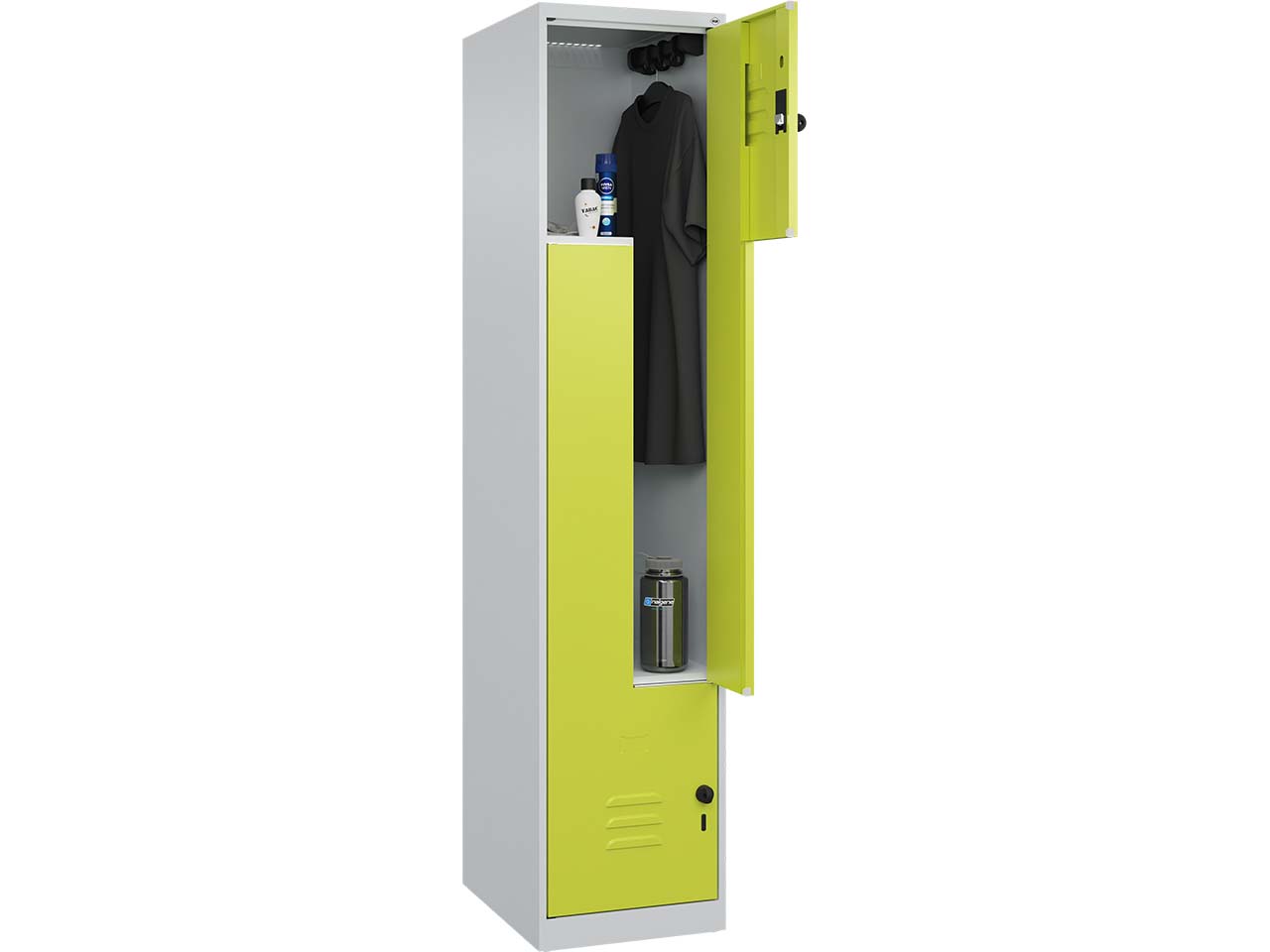 Das z-förmig unterteilte Abteil des Spinds macht es möglich, lange Kleidungsstücke komfortabel zu verstauen – und das selbst bei geringem Platzangebot. Der klassische Spind aus stabiler Stahlkonstruktion ist dank hochwertiger Einbrennbeschichtung beständig gegen UV und Korrosion. Im Inneren bietet die robuste Garderobenstange mit vier verdrehsicheren Doppel-Schiebehaken viel Platz für Jacken, Kittel, etc. Bodengleiter schützen sowohl den Schrank als auch den Fußboden vor Beschädigungen. Die Stahltüren sind mit einem Soft-Anschlag versehen und haben geschlossene Seitenprofile für zusätzliche Stabilität. Zwei ergonomische Sicherheits-Drehriegel ermöglichen die Nutzung von Vorhängeschlössern, während Lüftungskiemen für eine optimale Belüftung sorgen. B 40 x T 50 x H 185 cm.