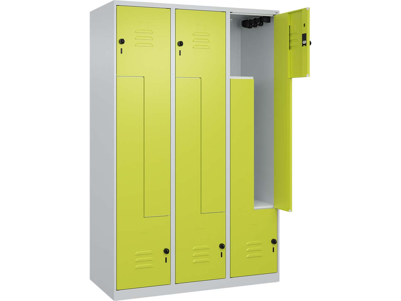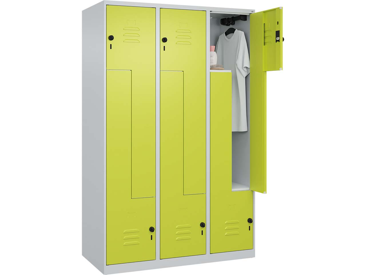 Der klassische Z-Spind mit drei z-förmig unterteilten Abteilen bietet Stauraum zur Aufbewahrung von Kleidungsstücken oder Wertgegenständen von bis zu 6 Personen. Der Korpus besteht aus einer stabilen Stahlkonstruktion, die dank einer hochwertigen Einbrennbeschichtung eine hohe UV- und Korrosionsbeständigkeit aufweist. Trotz des kompakten Designs ermöglicht der Spind eine bequeme Aufbewahrung langer Kleidungsstücke. Jedes Fach ist mit einer stabilen Garderobenstange und vier verdrehsicheren Doppel-Schiebehaken ausgestattet. Für eine gute Luftzirkulation sorgen Belüftungsöffnungen auf der Rückseite sowie Lüftungskiemen an der Ober- und Unterseite. Bodengleiter schützen sowohl den Schrank als auch den Boden vor Kratzern und Abnutzung. Für zusätzliche Sicherheit sorgen die sechs ergonomischen Sicherheits-Drehriegel, die für die Verwendung von Vorhängeschlössern geeignet sind. B 120 x T 50 x H 185 cm.