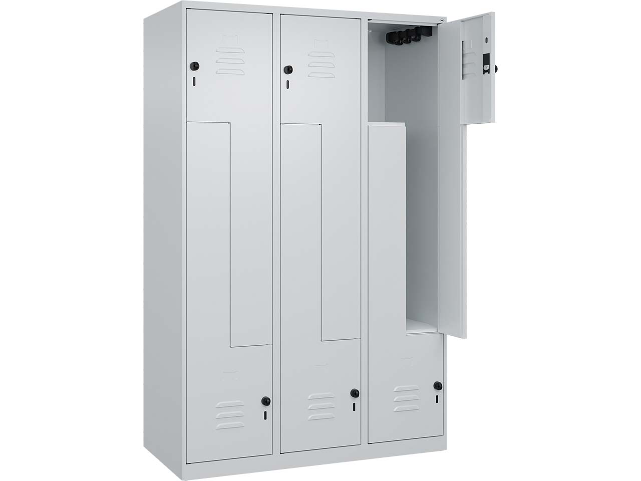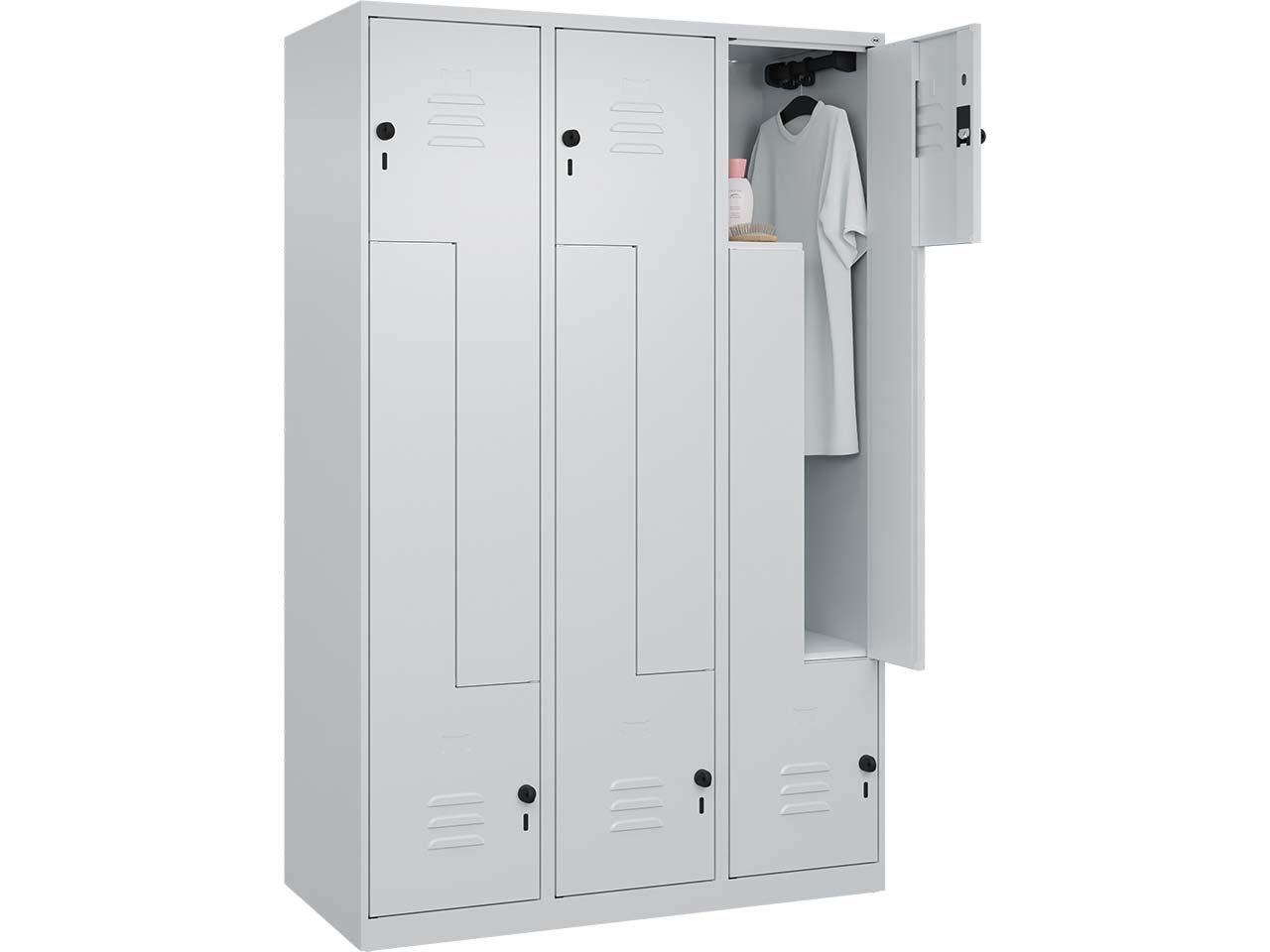 Der klassische Z-Spind mit drei z-förmig unterteilten Abteilen bietet Stauraum zur Aufbewahrung von Kleidungsstücken oder Wertgegenständen von bis zu 6 Personen. Der Korpus besteht aus einer stabilen Stahlkonstruktion, die dank einer hochwertigen Einbrennbeschichtung eine hohe UV- und Korrosionsbeständigkeit aufweist. Trotz des kompakten Designs ermöglicht der Spind eine bequeme Aufbewahrung langer Kleidungsstücke. Jedes Fach ist mit einer stabilen Garderobenstange und vier verdrehsicheren Doppel-Schiebehaken ausgestattet. Für eine gute Luftzirkulation sorgen Belüftungsöffnungen auf der Rückseite sowie Lüftungskiemen an der Ober- und Unterseite. Bodengleiter schützen sowohl den Schrank als auch den Boden vor Kratzern und Abnutzung. Für zusätzliche Sicherheit sorgen die sechs ergonomischen Sicherheits-Drehriegel, die für die Verwendung von Vorhängeschlössern geeignet sind. B 120 x T 50 x H 185 cm.