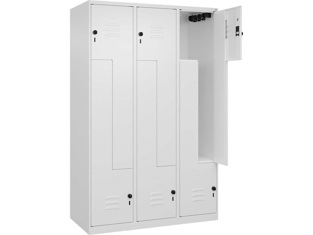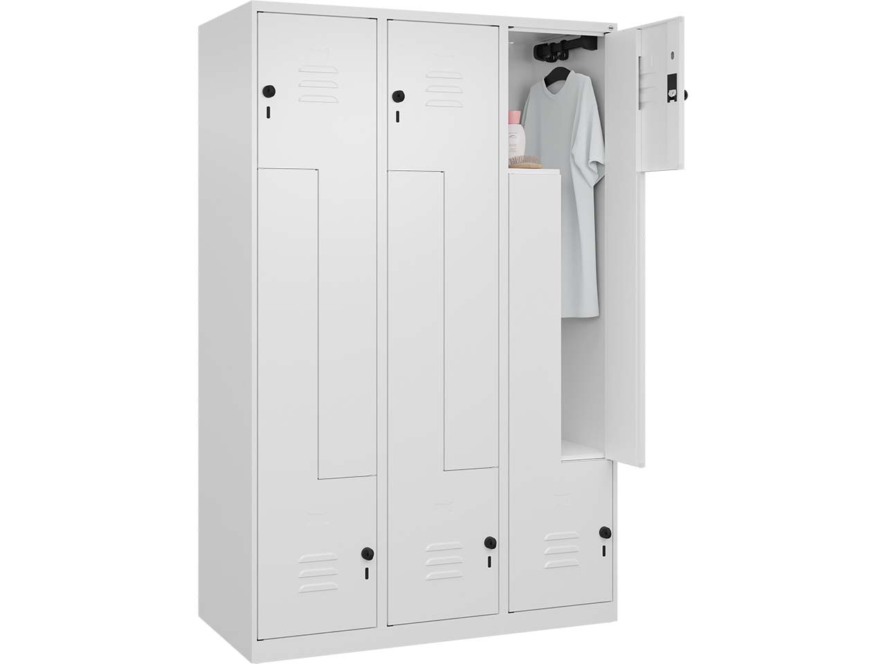 Der klassische Z-Spind mit drei z-förmig unterteilten Abteilen bietet Stauraum zur Aufbewahrung von Kleidungsstücken oder Wertgegenständen von bis zu 6 Personen. Der Korpus besteht aus einer stabilen Stahlkonstruktion, die dank einer hochwertigen Einbrennbeschichtung eine hohe UV- und Korrosionsbeständigkeit aufweist. Trotz des kompakten Designs ermöglicht der Spind eine bequeme Aufbewahrung langer Kleidungsstücke. Jedes Fach ist mit einer stabilen Garderobenstange und vier verdrehsicheren Doppel-Schiebehaken ausgestattet. Für eine gute Luftzirkulation sorgen Belüftungsöffnungen auf der Rückseite sowie Lüftungskiemen an der Ober- und Unterseite. Bodengleiter schützen sowohl den Schrank als auch den Boden vor Kratzern und Abnutzung. Für zusätzliche Sicherheit sorgen die sechs ergonomischen Sicherheits-Drehriegel, die für die Verwendung von Vorhängeschlössern geeignet sind. B 120 x T 50 x H 185 cm.
