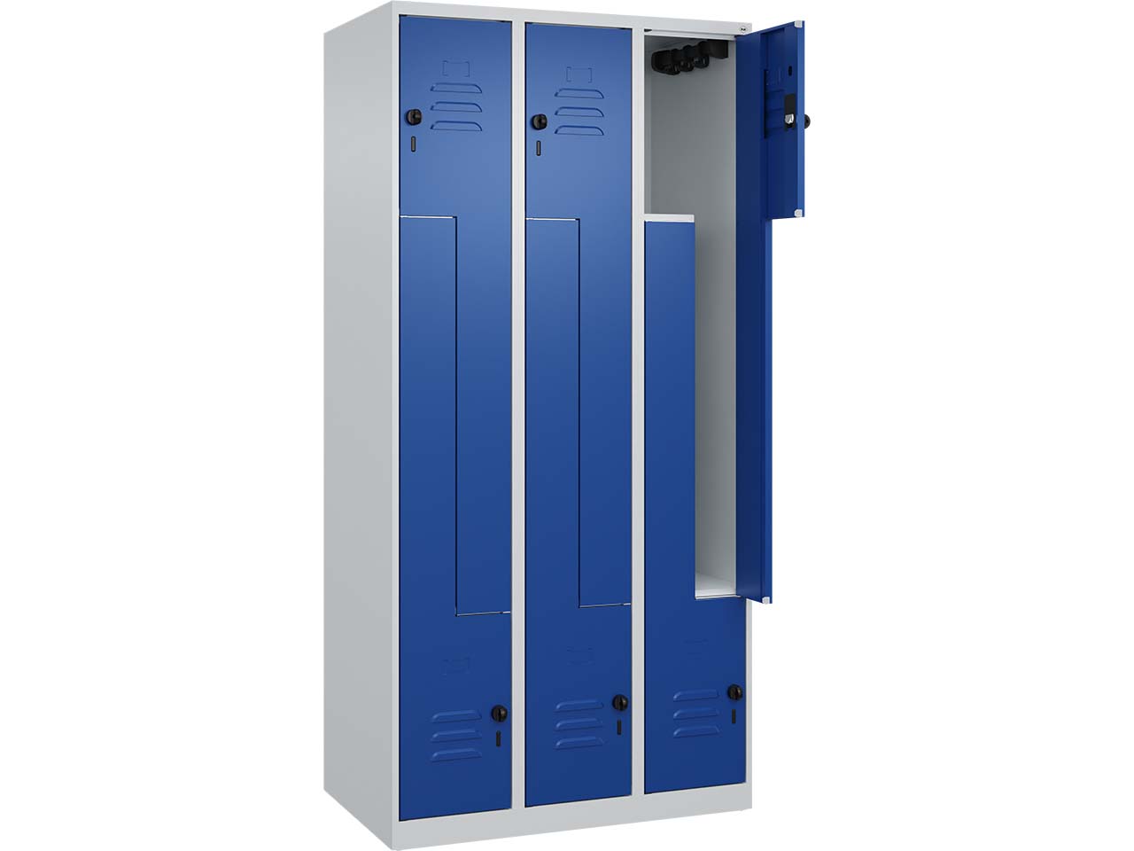 Der Z-Spind ist ideal für bis zu 6 Personen geeignet und bietet dank seiner z-förmigen Unterteilung in drei Abteile eine effiziente Nutzung des Platzes. Mit dem stabilen Stahlkorpus, der durch eine hochwertige Einbrennbeschichtung gegen UV-Strahlung und Korrosion geschützt ist, gewährleistet der Spind eine hohe Langlebigkeit. Innen bietet er eine komfortable Möglichkeit, auch lange Kleidungsstücke platzsparend aufzuhängen. Jedes Fach ist mit einer Garderobenstange und drei verdrehsicheren Doppel-Schiebehaken ausgestattet. Für eine optimale Luftzirkulation sorgen Belüftungsöffnungen an der Ober- und Unterseite sowie zusätzliche Lüftungskiemen. Die Türen bestehen aus robustem Stahl, öffnen sich um 110 Grad und sind mit einem Soft-Anschlag und geschlossenen Seitenprofilen versehen, was für hohe Stabilität sorgt. Die sechs ergonomischen Sicherheits-Drehriegel sind für die Verwendung mit Vorhängeschlössern ausgelegt und bieten zusätzlichen Schutz. B 90 x T 50 x H 185 cm.