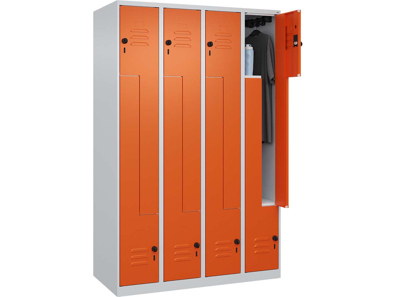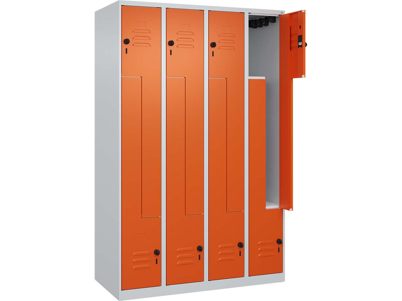 Der klassische Z-Spind mit drei z-förmig unterteilten Abteilen bietet Stauraum zur Aufbewahrung von Kleidungsstücken oder Wertgegenständen von bis zu 6 Personen. Der Korpus besteht aus einer stabilen Stahlkonstruktion, die dank einer hochwertigen Einbrennbeschichtung eine hohe UV- und Korrosionsbeständigkeit aufweist. Trotz des kompakten Designs ermöglicht der Spind eine bequeme Aufbewahrung langer Kleidungsstücke. Jedes Fach ist mit einer stabilen Garderobenstange und vier verdrehsicheren Doppel-Schiebehaken ausgestattet. Für eine gute Luftzirkulation sorgen Belüftungsöffnungen auf der Rückseite sowie Lüftungskiemen an der Ober- und Unterseite. Bodengleiter schützen sowohl den Schrank als auch den Boden vor Kratzern und Abnutzung. Für zusätzliche Sicherheit sorgen die sechs ergonomischen Sicherheits-Drehriegel, die für die Verwendung von Vorhängeschlössern geeignet sind. B 120 x T 50 x H 185 cm.