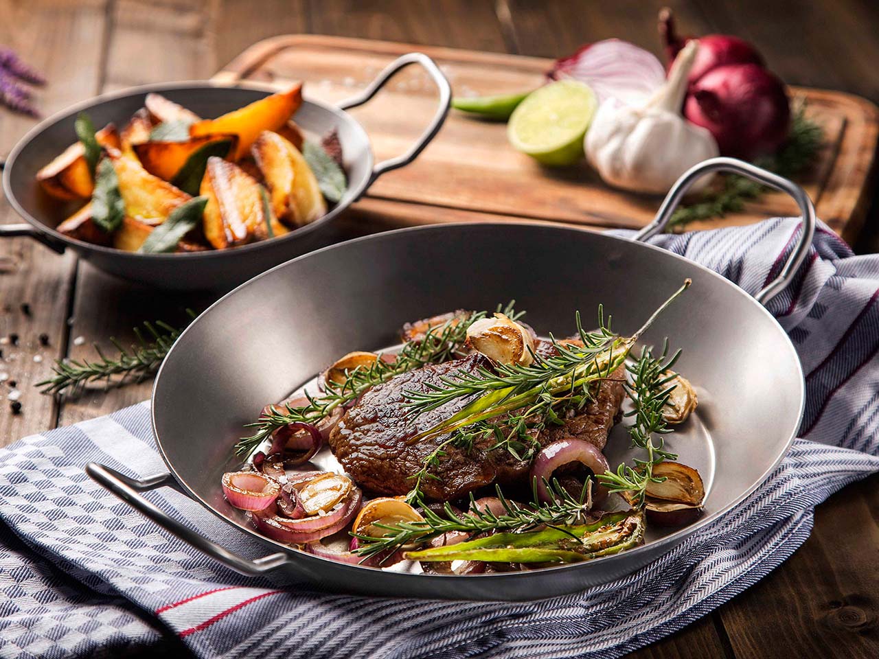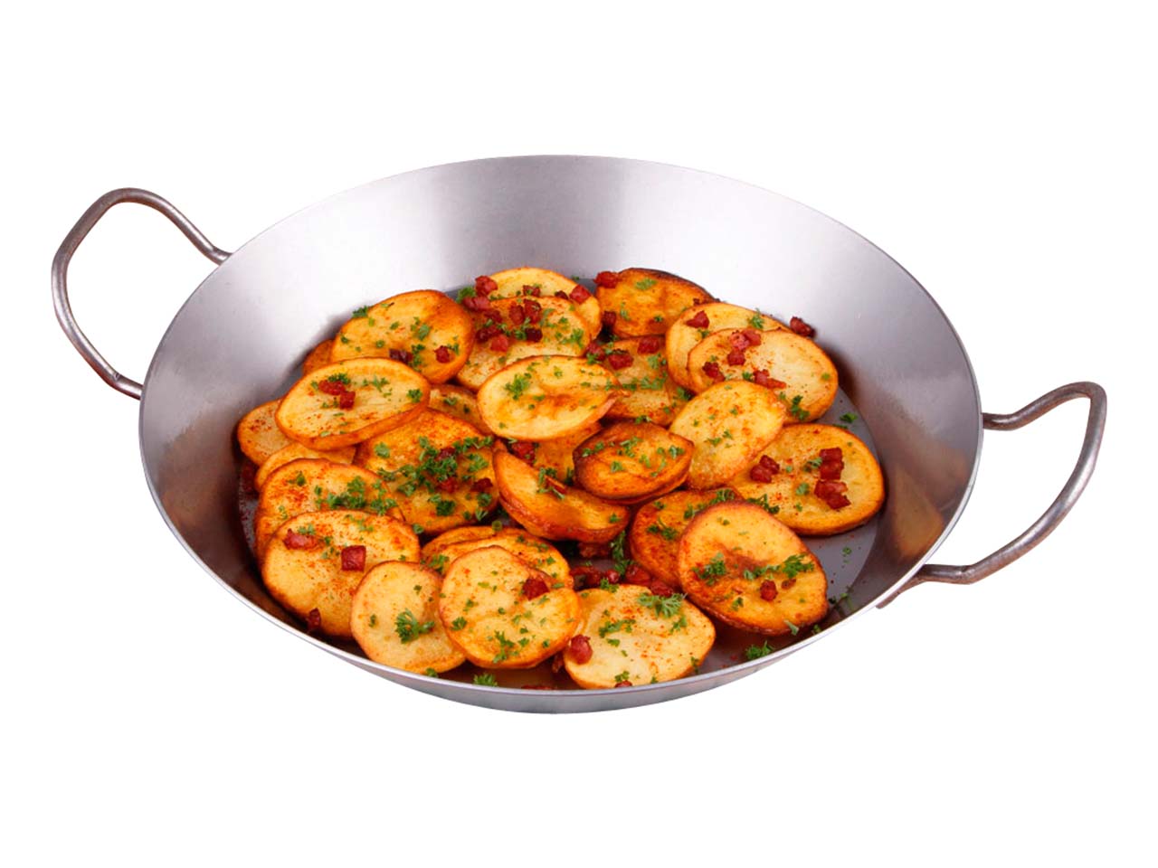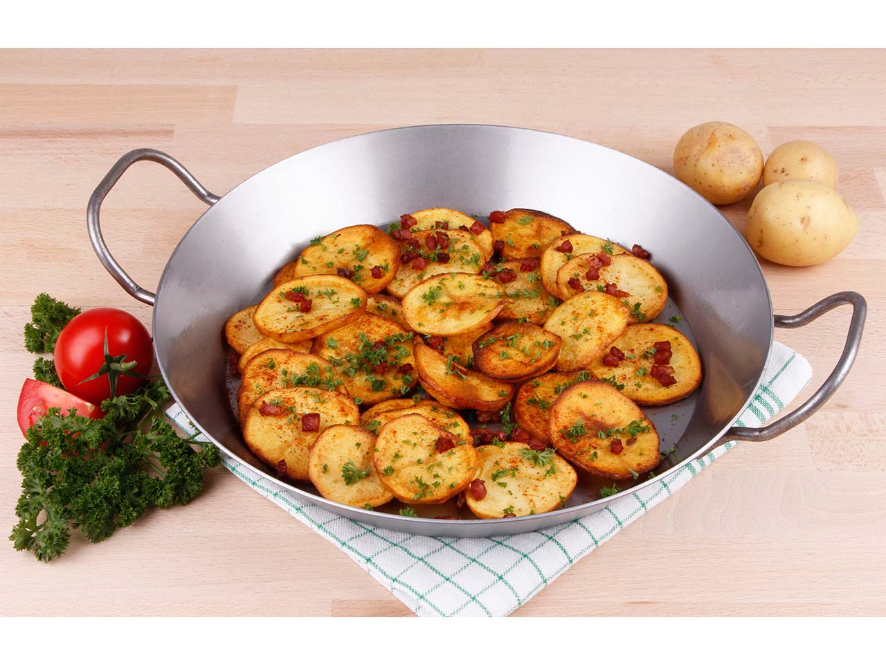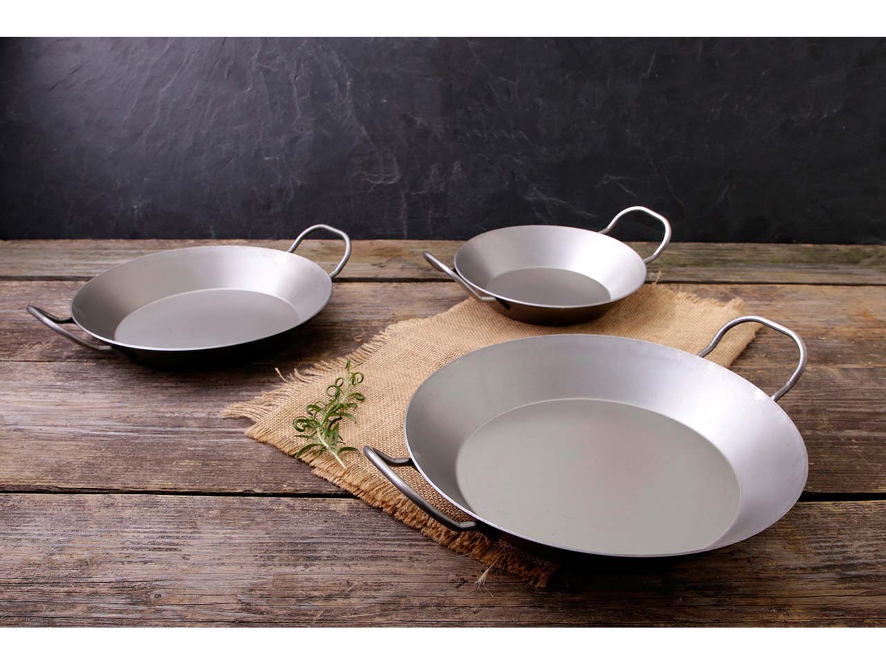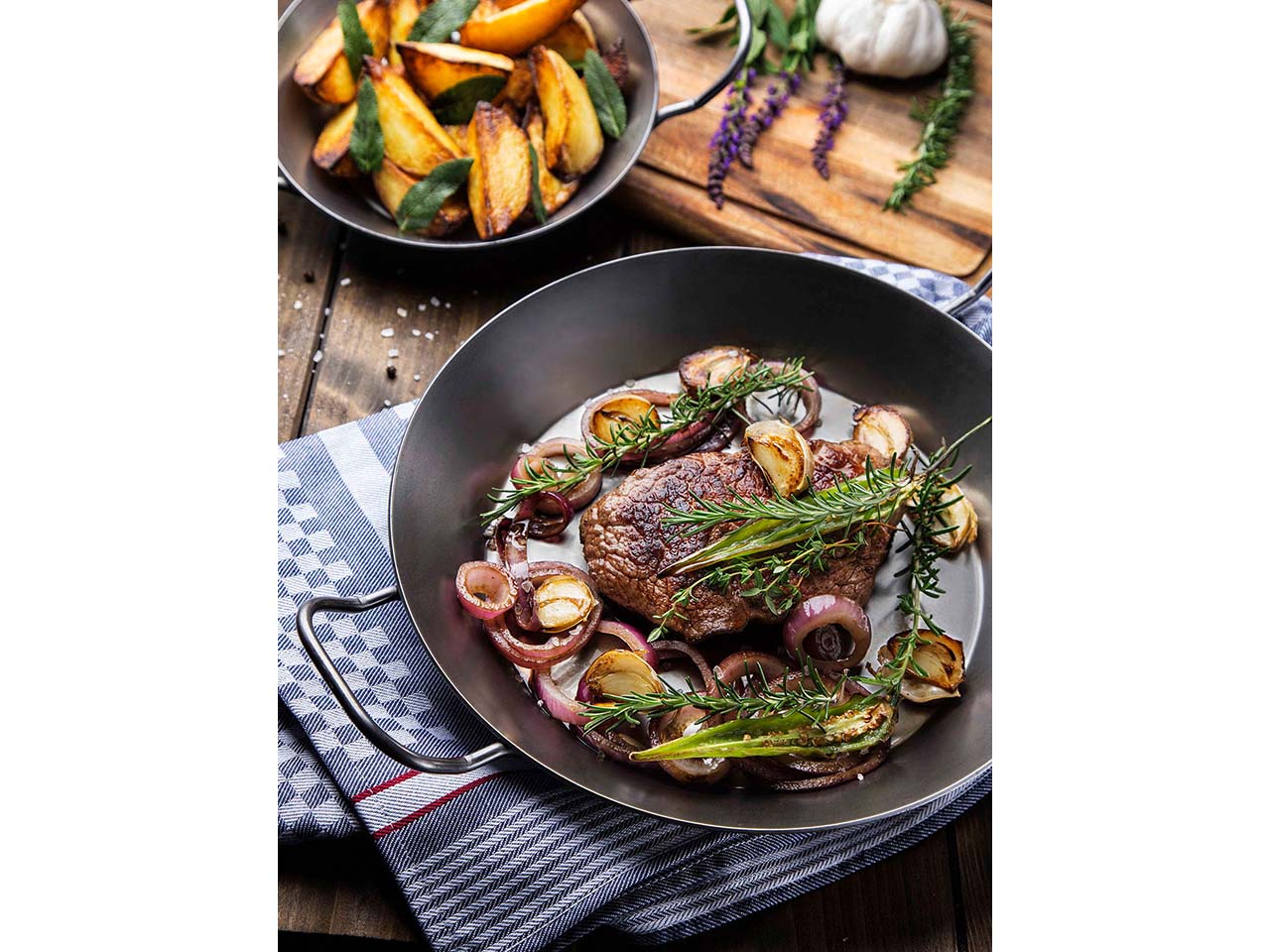 Eisenpfannen genießen in der Küche zu Recht einen guten Ruf. Die unbeschichtete Pfanne überzeugt mit hervorragenden Eigenschaften. Die 2 mm starke Bratpfanne aus Eisen ist strapazierfähig und langlebig. Besonders gut geeignet für scharfgebratenes wie z.B. Steaks, Schnitzel, Bratenstücke oder Röstkartoffeln.