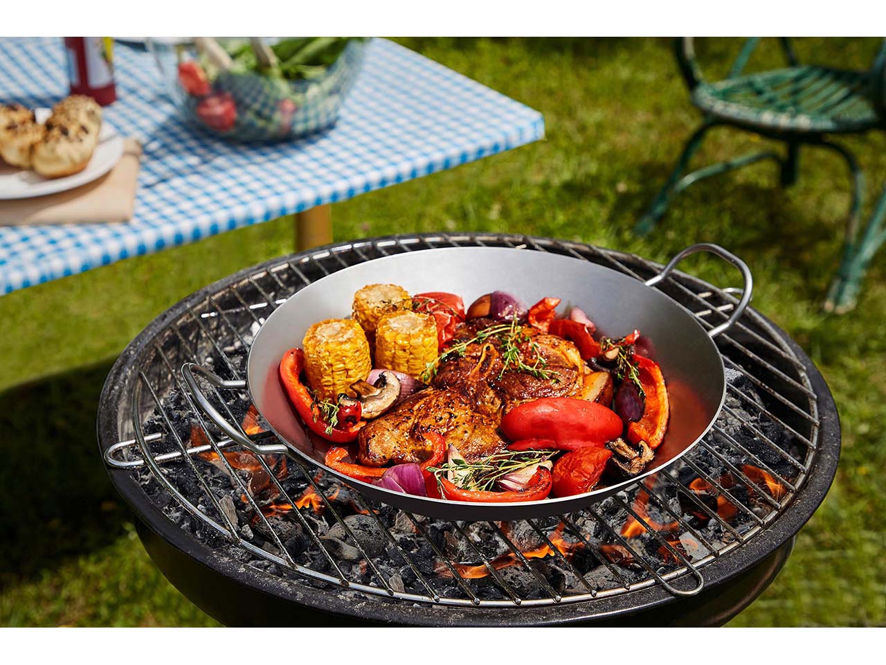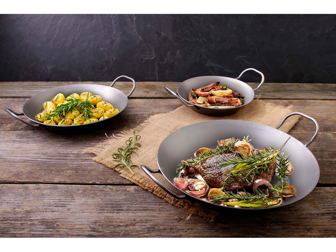 Feinschmecker werden es zu schätzen wissen, dass Lebensmittel beim Braten ihren natürlichen Eigengeschmack behalten. Optisch müssen keine Abstriche gemacht werden: Die Eisenpfanne besticht mit ihrem rustikalen Flair, sodass sie sich auch als Servierpfanne nutzen lässt. Zwei nicht thermoisolierte Griffe helfen bei der Handhabung. Für alle Herdarten geeignet.