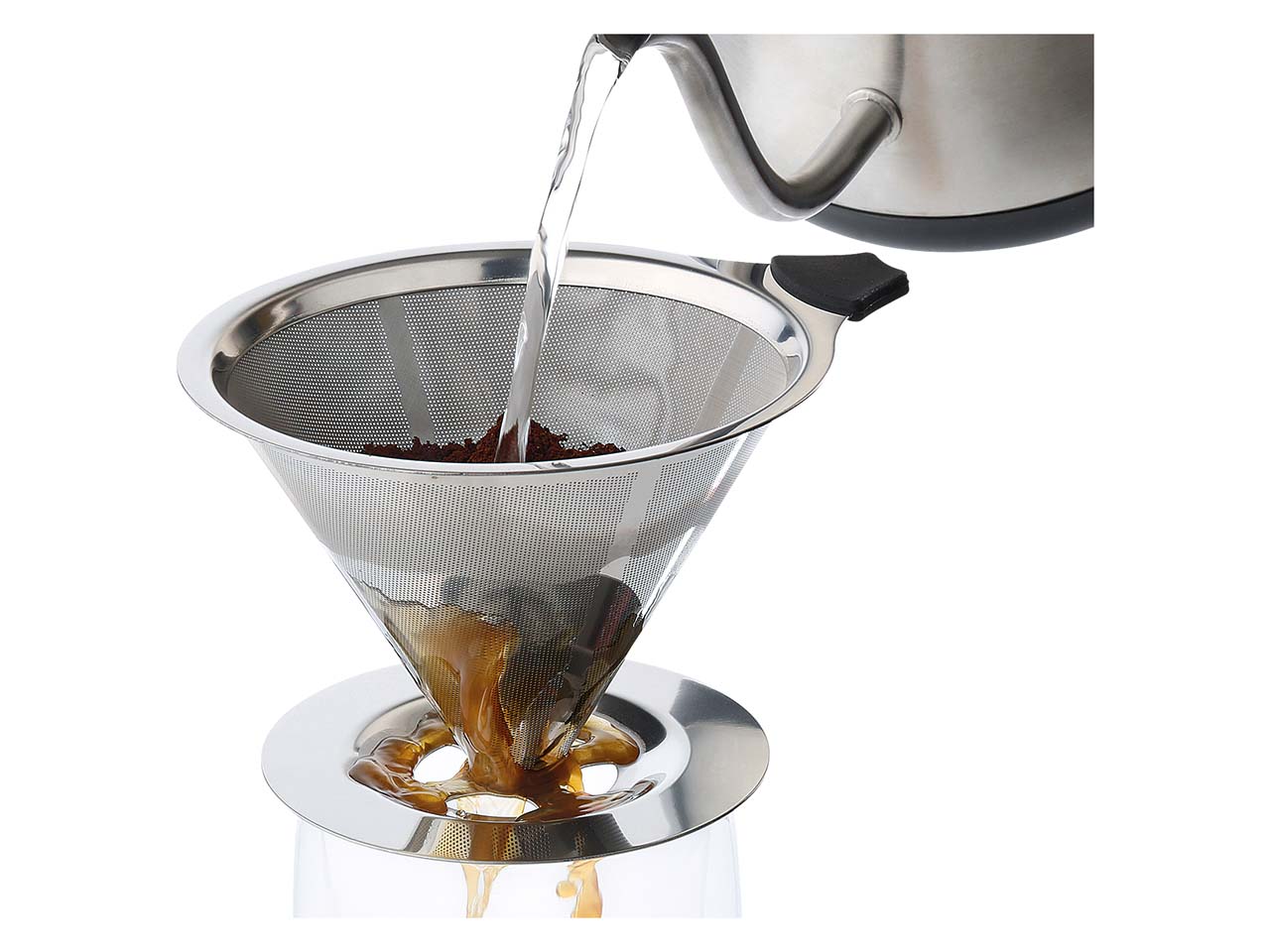 Perfekte Lösung für eine leckere Tasse Kaffee zum Frühstück oder mitten am Tag. Der Kaffee schmeckt mir besser als mit Papierfilter. Sofort den Kaffeesatz an die Hortensien oder die Rosen (oder entsorgen), den Filter kurz mit Wasser abspülen und er ist bereit für den nächsten Einsatz.