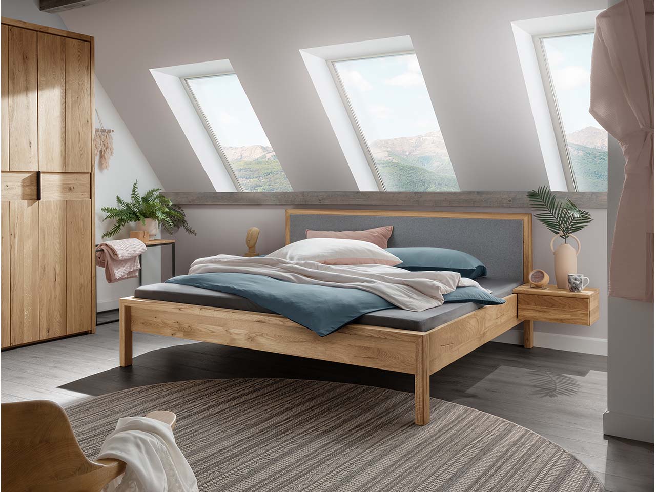 Mit diesem Bettgestell zieht die Schönheit der Natur ins Schlafzimmer ein. Das Bett aus Eiche massiv ist FSC-zertifiziert und schafft es mit seiner geradlinigen Optik ein harmonisches Design zu kreieren, das in verschiedene Raumkonzepte passt. Durch die geölte Oberfläche entsteht eine offenporige Qualität und die sanften Nuancen des Holzes kommen zum Vorschein. Das niedrige Fußteil unterstreicht die moderne Ausrichtung des Bettes. Highlight aber ist das Kopfteil, das mit weichem Filz bezogen ist und so eine besonders gemütliche Atmosphäre schafft, die zum Entspannen und Verweilen einlädt. Unter dem Bett befindet sich praktischer Stauraum für die Aufbewahrung einer Unterbettbox. Ein passender Nachttisch ist separat erhältlich. Das Massivholzbett ist in verschiedenen Größen verfügar.