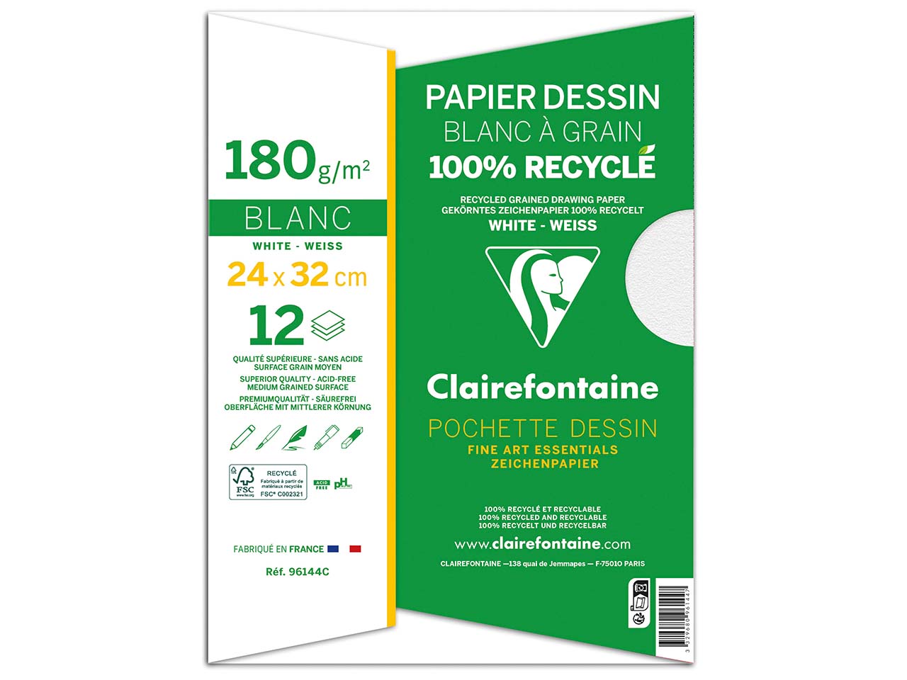 Dieses FSC-zertifizierte Recycling-Zeichenpapier von Clairefontaine eignet sich aufgrund der zwei unterschiedlichen Oberflächen für Trocken- und Nasstechniken. Die feinkörnige Seite ist ideal für die Nutzung mit Blei- oder Buntstift, Kohle oder Pastell. Die grobkörnige Seite ist perfekt für alle nassen Techniken wie z.B. Acryl oder Tusche. Durch die hohe Grammatur von 180 g/m² ist das Papier sehr robust und macht viel mit. Format 24 x 32 cm, 12 Blatt.