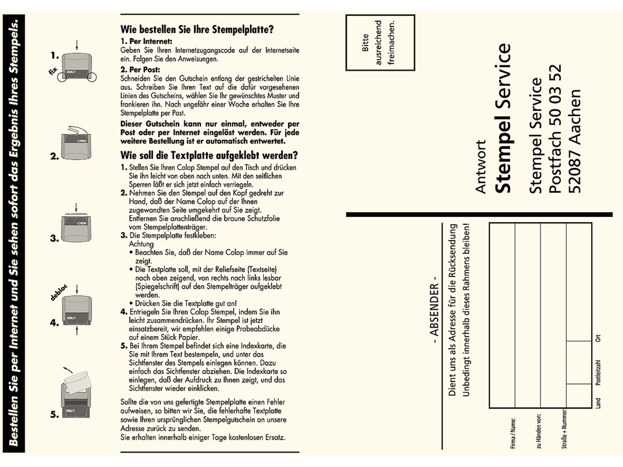 Mit der Lieferung erhalten Sie einen Gutscheincode, den sie auf memo-stempel.de einlösen. Alternativ können Sie Ihre Daten auch per Post einschicken. Die individualisierte Textplatte wird nach einigen Tagen vom Hersteller verschickt.