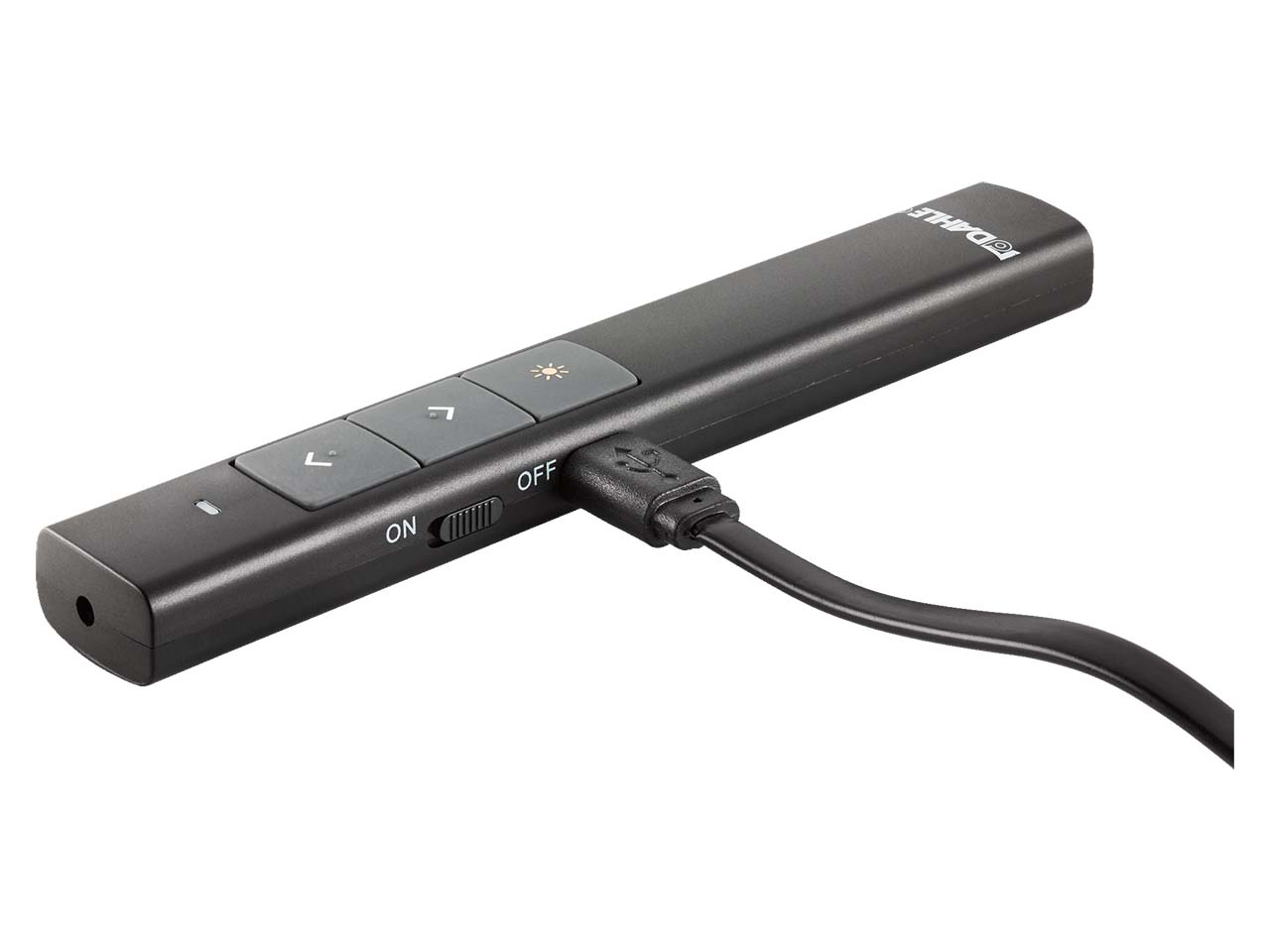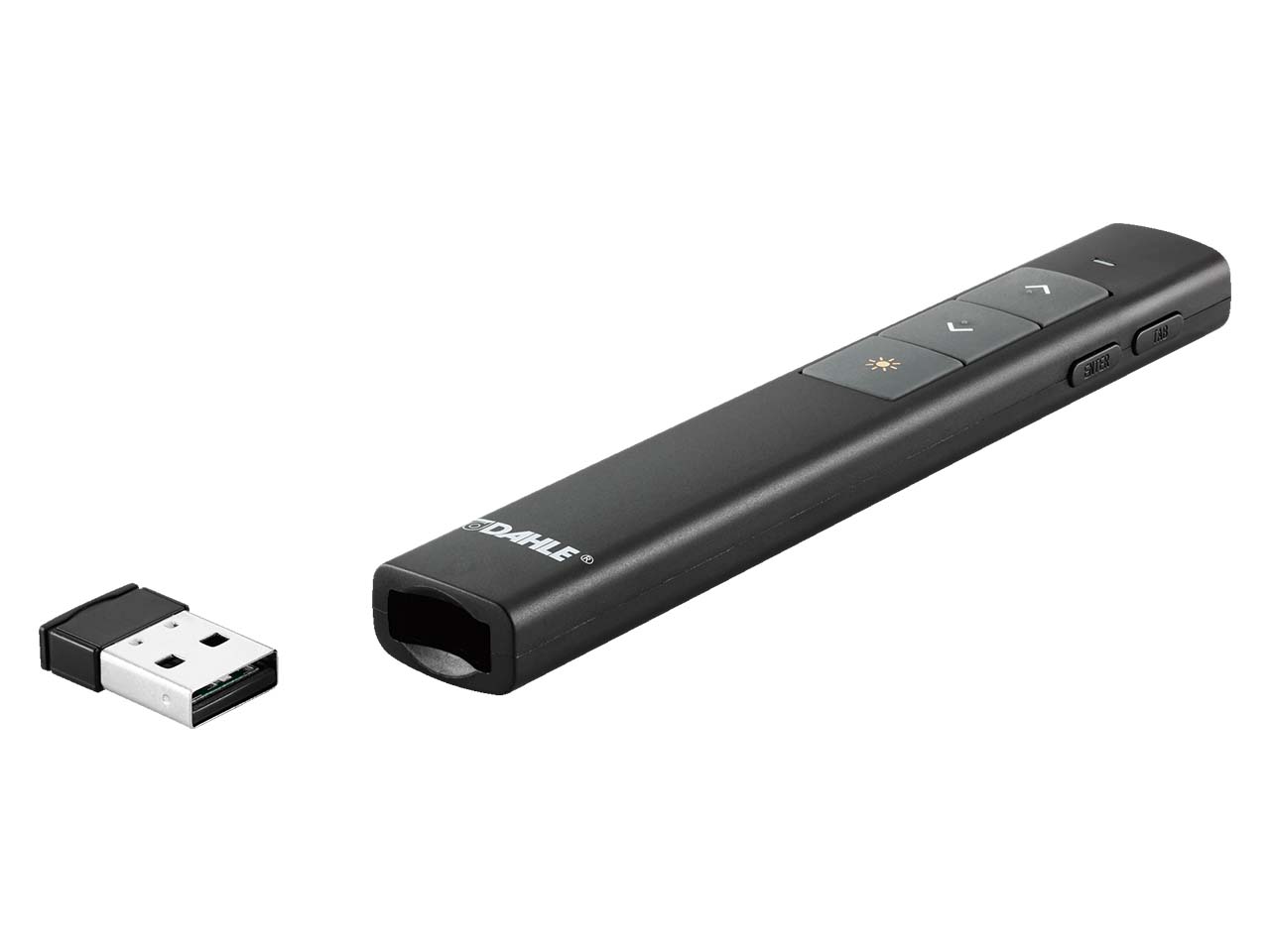 Dieses kompakte Präsentationszubehör von Dahle ist nicht nur Laserpointer, sondern gleichzeitig auch Präsentationsfernsteuerung. Damit ist er bei Seminaren und Meetings unverzichtbar! Der Laserpräsenter 95100 ist mit einem Lithium-Ionen-Akku versehen, der sich wieder aufladen lässt. Batterien werden hier demnach nicht benötigt. Das Laden erfolgt über USB. Die Fernbedienung ist mit Windows XP/7/8/10, Mac OS, Linux und Android kompatibel und ist ideal, um Präsentationen von PowerPoint, keynote, Prezi oder OpenOffice zu steuern. Der Laserpräsenter in Stiftform liegt sehr gut in der Hand und ist einfach zu bedienen. L 12,8 cm.