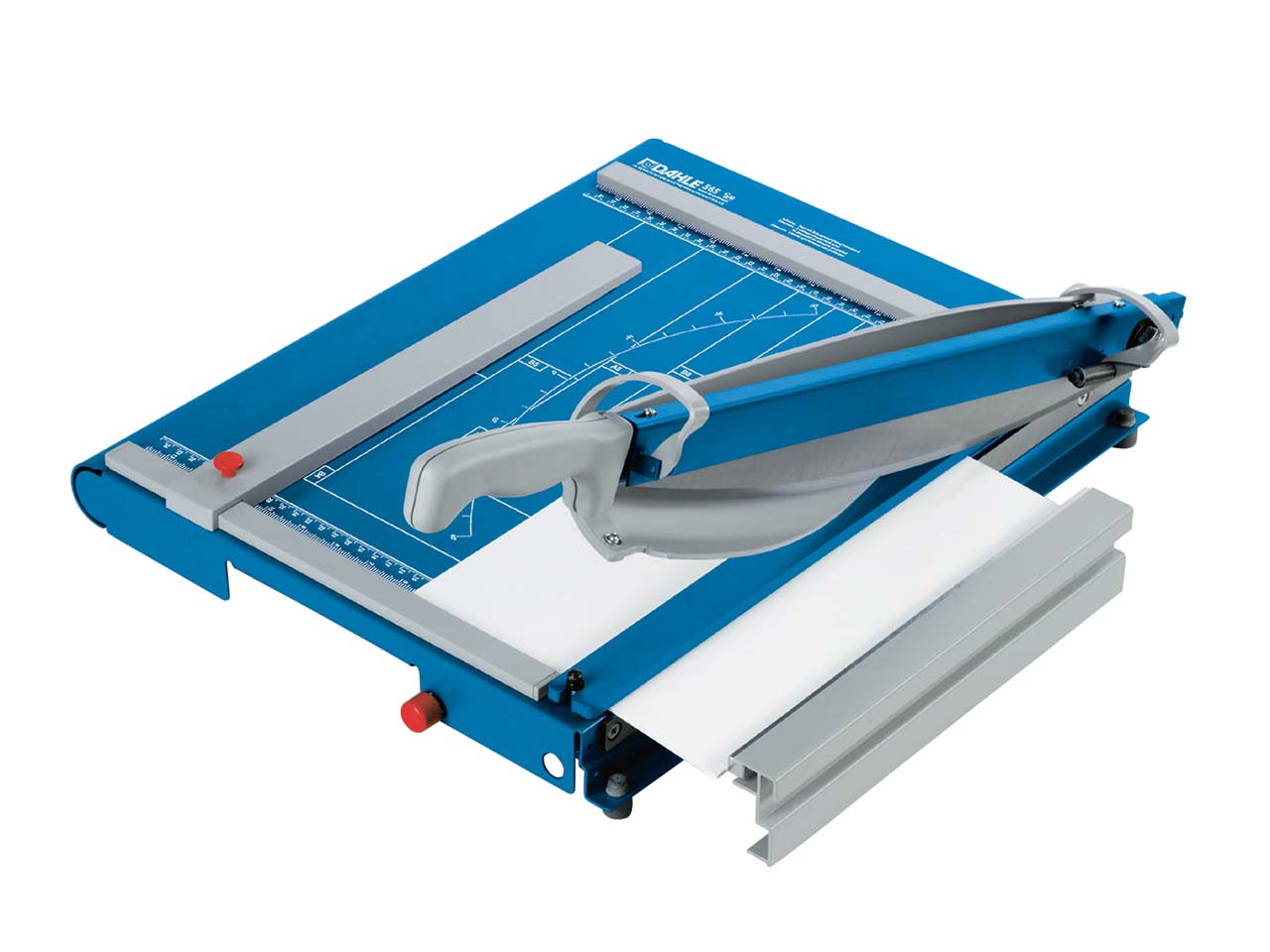 Der Dahle Hebelschneider "565" eignet sich für größere Papierformate und verarbeitet bis zu 40 Blatt (70 g/m²) gleichzeitig. Mit verstellbarem Rückanschlag, Sicherheitsautomatik und Raster mit Formatgröße. Schnitthöhe: 4 mm. Schnittlänge: 39 cm. L 47,5 x B 35,5 cm.
