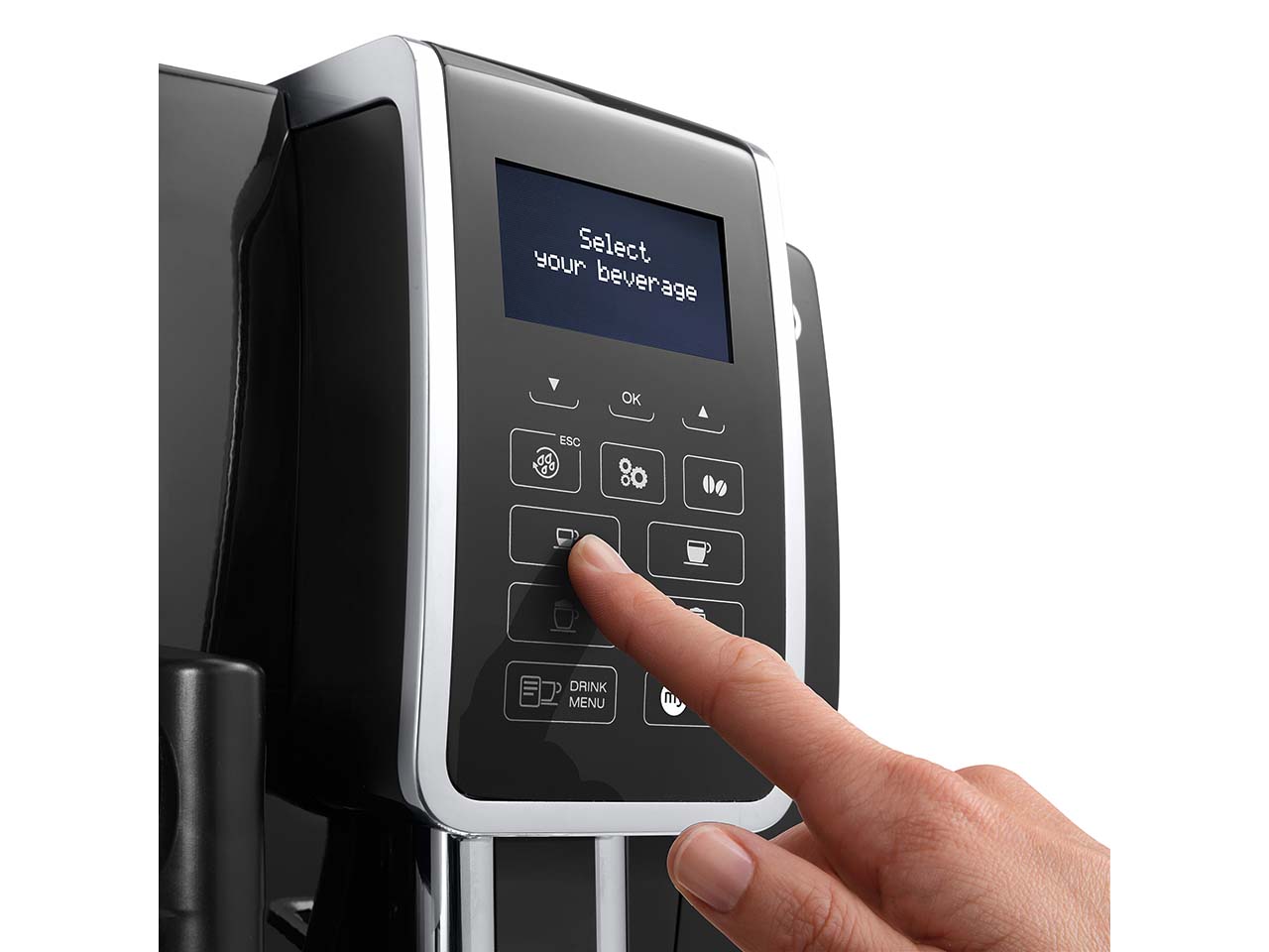 Bereiten Sie mit dem De'Longhi Kaffeevollautomat "ECAM 350.55.B Dinamica" bis zu 14 verschiedene Spezialitäten zu, z.B. Espresso oder Latte Macchiato. Die Bedienung gestaltet sich dabei dank LCD-Display mit Direktwahltasten ganz einfach. Durch die patentierte Latte-Crema-Milchaufschäumdüse mit Vario-Drehregler kommen Sie zusätzlich in den Genuss von besonders cremigem, feinporigem Milchschaum. B 236 x T 429 x H 348 mm.