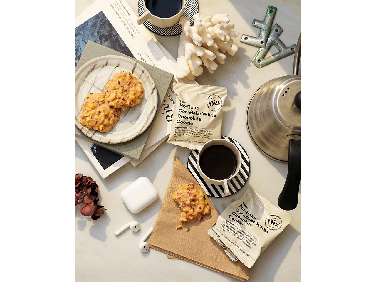 Die Produkte von Dig stellen eine Alternative zu stark zuckerhaltigen Snacks dar. Sie sind zu 100 % vegan und enthalten wenige Zutaten. Die Inspiration für die Geschmackrichtungen kommt dabei von Keksen, Süßigkeiten und anderen Snacks. Die Snack-Alternativen entstehen auf Basis von bio-zertifizierten Zutaten, die nur minimal verarbeitet sind, um die Nährstoffe zu enthalten. Die Produkte enthalten keine Zusatzstoffe, raffinierten Zucker und sind immer vegan und glutenfrei. Dig arbeitet daran, die Plastikverpackung, in der die Riegel verpackt sind, nachhaltiger zu gestalten. Rund 70 % des Plastiks bestehen aus bio-basiertem Kunststoff.