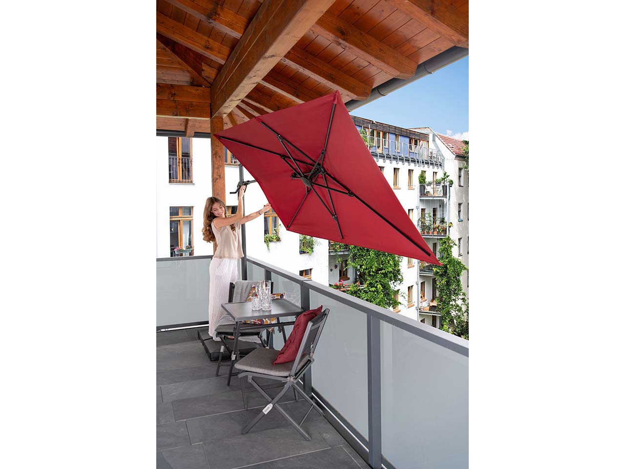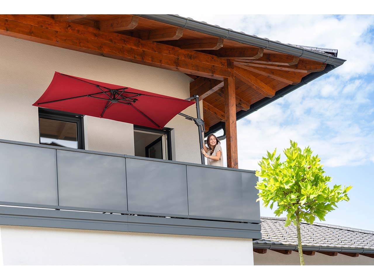 Dieser moderne, schicke Pendelschirm schützt selbst auf kleineren Balkons vor UV-Strahlen! Er bringt die Funktionen eines großen Ampelschirms mit, braucht aber viel weniger Platz. Das halbierte Standkreuz ermöglicht es, den Sonnenschirm nah an einem Tisch oder dem Balkongelände hinzustellen. Die Höhe ist ganz einfach per Fußtaster einstellbar. Das Schirmdach aus recyceltem PET hat LSF 50+ und ermöglicht so Sonnengenuss mit effektivem Schutz vor UV-Strahlung. Lieferung inkl. Standkreuz (ohne Platten). B 240 x T 135 cm.