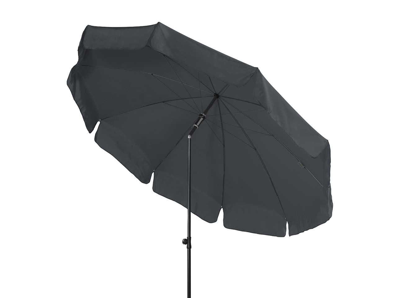 Wunderschöner Schattenspender, der auf dem Balkon, auf der Terrasse und im Garten gut aussieht. Das hochwertige Stahlgestell des Sonnenschirms ist besonders stabil und langlebig. Es lässt sich knicken, sodass eine Anpassung an den jeweiligen Sonnenstand jederzeit möglich ist. Viel Schutz entsteht auch durch das Schirmdach aus schwerem Polyestergewebe, das wasserabweisend ist und mit LSF 50+ effektiven UV-Schutz bietet. Die Bedienung gestaltet sich kinderleicht: Schieber und Verstellrad zur Höhenverstellung sind gummiert und daher rutschfest. Der Sonnenschirm ist für verschiedene Befestigungsvarianten geeignet. Praktisch: Der Polyesterbezug lässt sich abnehmen und per Hand waschen. Ø 250 cm.