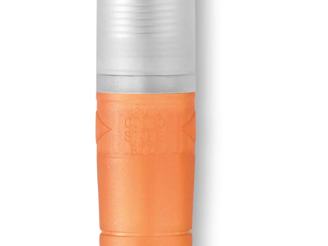 Umweltverträglich, praktisch und modern: Dieser Kugelschreiber punktet gleich dreifach! Gefertigt ist das Schreibgerät nämlich zum Großteil aus biologisch abbaubarer Polymilchsäure (PLA). Nur Innenmechanik und Drücker bestehen nicht aus dem Material sondern aus ABS. Neben der exzellenten Nachhaltigkeit überzeugt der Kugelschreiber auch optisch: Die Kombination aus Transparenz und kräftiger Farbe verleiht dem Stift eine frische Note. Die farbige, gefrostete Grifffläche hat leichte Einkerbungen, sodass man beim Schreiben nicht abrutscht. Die X-22 Mine ist nach ISO 12757-2 dokumentenecht und lässt sich auswechseln. Das macht das Schreibgerät langlebig. Mit dem praktischen Clip lässt sich der Kugelschreiber z.B. an einem Block oder der Hemdtasche fixieren.