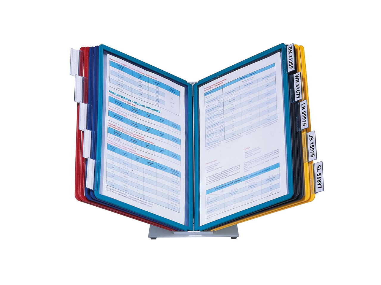 Das Sichttafelsystem "table 10" ist mit seinen L-förmig geneigten Standfüßen absolut standfest. In der Lieferung enthalten sind 10 farbige Sichttafeln und 10 Klarsichtreiter. Durch das innovative System lassen sich die einzelnen Tafeln schnell und einfach entnehmen und wieder einsetzen. Für Format DIN A4. B 34 x T 21 x H 34 cm. Jeweils 2 Sichttafeln in Schwarz, Rot, Gelb, Grün und Blau.