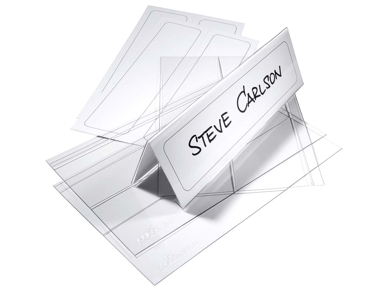 Die durchsichtigen Tischnamensschilder aus PET sind vorgefalzt. Sie eignen sich dank der Aufstellung in Dachform zum beidseitigen Beschriften. Ideal für Seminare und Tagungen, um die Anrede zu vereinfachen. Die Schilder werden inkl. 10 auswechselbaren Einsteckschildern mit Dekorahmen geliefert. B 210 x H 61 mm. 1 Pack = 10 Stk.
