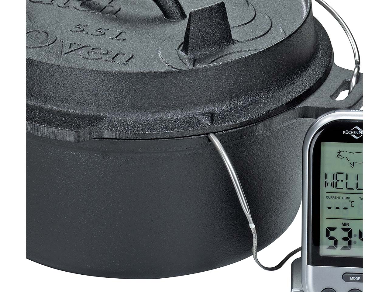Ein echtes Multitalent, das von Pizza, über Eintöpfe und Brot bis zum Krustenbraten alles zubereitet! Der traditionelle Dutch Oven aus Gusseisen ist besonders vielseitig und eignet sich für Grills, Feuerschalen, Backöfen und alle Herdarten. Eine integrierte Öffnung am Topfrand ermöglicht es, ein Thermometer einzuhängen und die Kerntemperatur von Fleisch zu überwachen. Essen zubereiten, während man es sich mit Freund:innen und Familie gemütlich macht? Selbst das schafft das Kochgeschirr mühelos, denn dank integriertem Henkel kann es ganz einfach über ein Lagerfeuer eingehängt werden. Ein weiteres Highlight ist die spezielle Deckelform für das Auflegen von Holzkohle. Der Dutch Oven ist das perfekte Kochgeschirr für alle, die gerne flexibel sind.