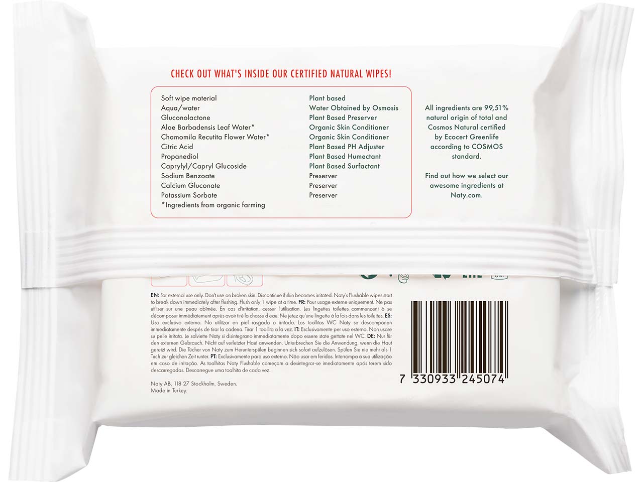 Herkömmliche Feuchttücher bestehen meistens aus Kunstfasern oder enthalten Plastik. Werden sie in der Toilette heruntergespült, verstopfen sie die Kanalisation und belasten und die Umwelt. Über die Tücher wird unter anderem Plastik und Mikroplastik in Gewässer transportiert. Die Feuchttücher von ECO by Naty bestehen zu 100 % aus bio-basierten Materialien und enthalten zu 98,4 % reines Wasser. Sie sind so konzipiert, dass sie in einer natürlichen Süßwasserumgebung biologisch abbaubar sind. Sie können bedenkenlos in der Toilette heruntergespült werden.