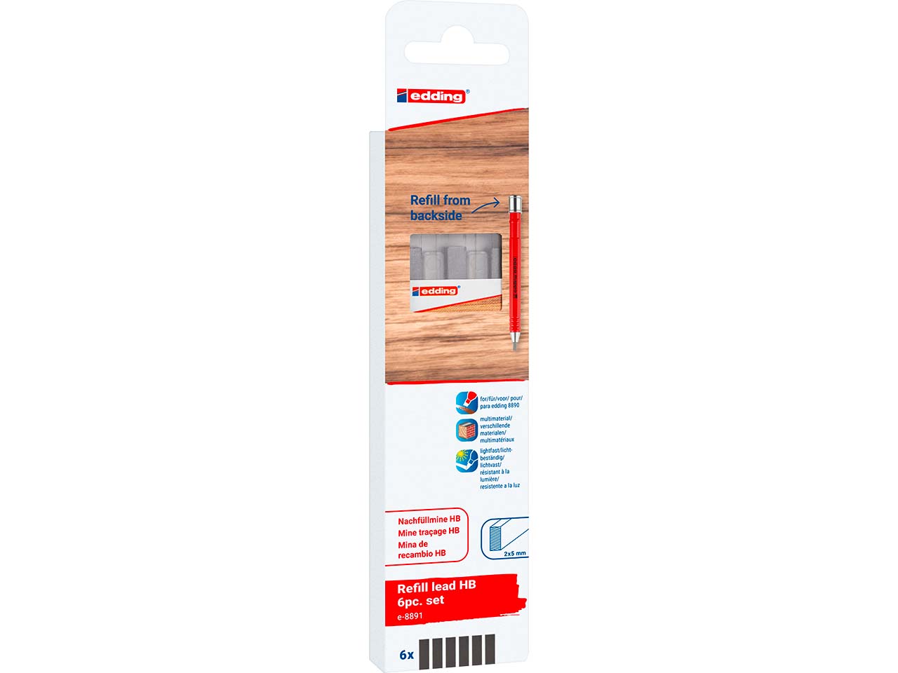 Die Nachfüllminen sind speziell für den edding Zimmermannsbleistift 8890 entwickelt. Das Austauschen gestaltet sich sehr einfach. Die HB-Graphitminen in rechteckiger Form können mithilfe von Schleifpapier oder einem harten Stein geformt werden. So entsteht eine individuelle Mine. Die Markierungen der Mine sind lichtbeständig.