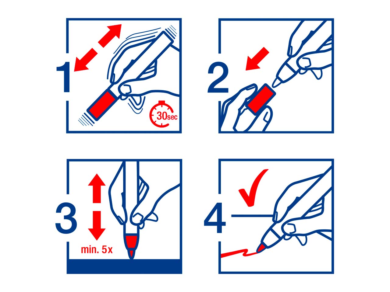 Den Marker mit geschlossener Kappe so lange schütteln bis die Mischkugel im Inneren anfängt ein klackendes Geräusch zu machen. Dann die Kappe abnehmen und den Marker mit der Spitze nach unten auf einem Testpapier anpumpen. Je nach Stiftgröße kann dies einen Moment länger dauern.