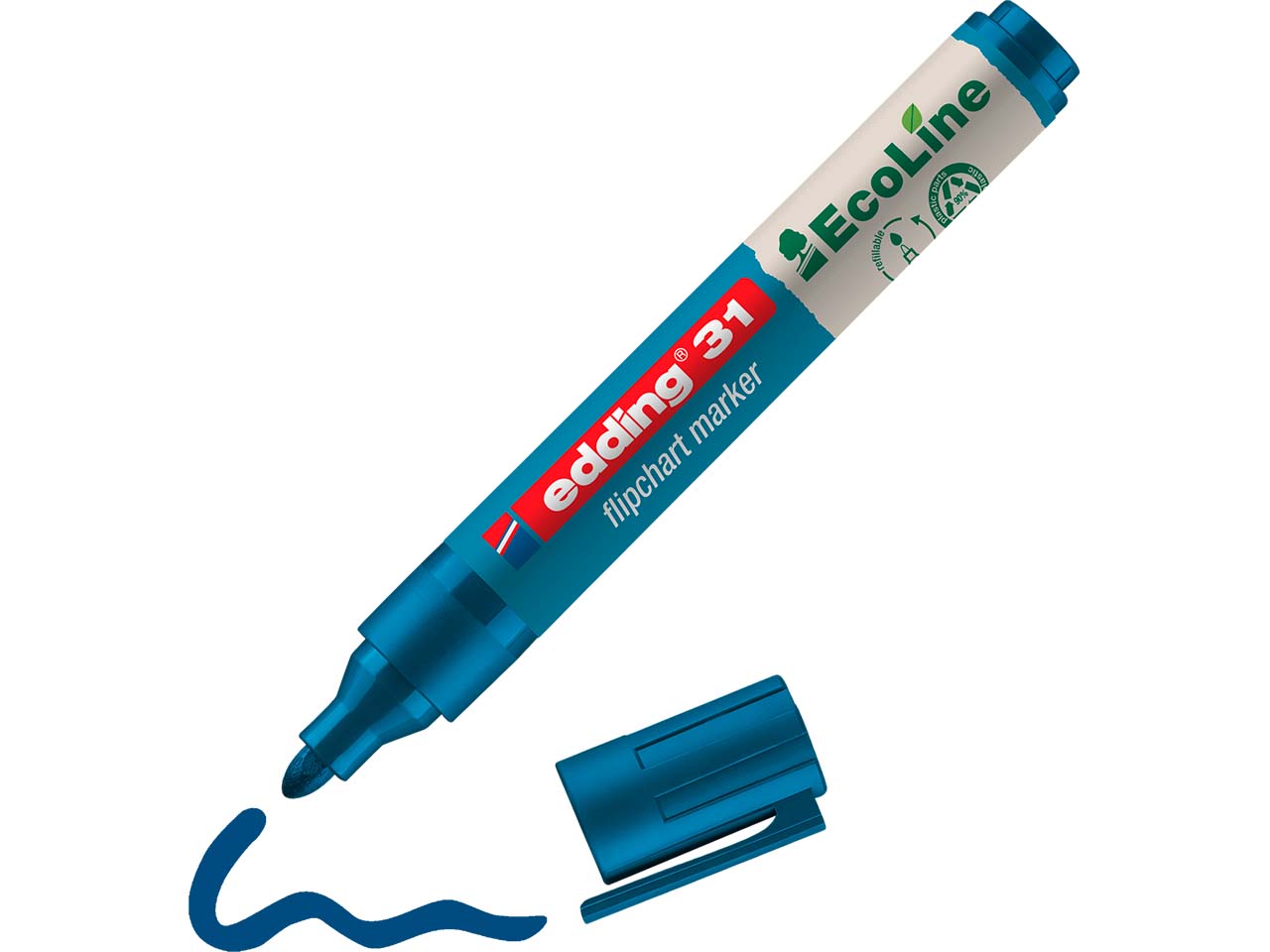 Der geruchsneutrale edding Flipchart-Marker "EcoLine 31" ist bei Präsentationen unersetzlich. Die wasserbasierte Tinte schlägt beim Schreiben auf Flipchart-Papier, Moderationspapier oder Moderationskarten nicht durch. Die Kunststoffteile bestehen zu mindestens 90 % aus recyceltem Material. Der Marker lässt sich nachfüllen, die Rundspitze ist austauschbar. Strichstärke 1,5-3 mm.