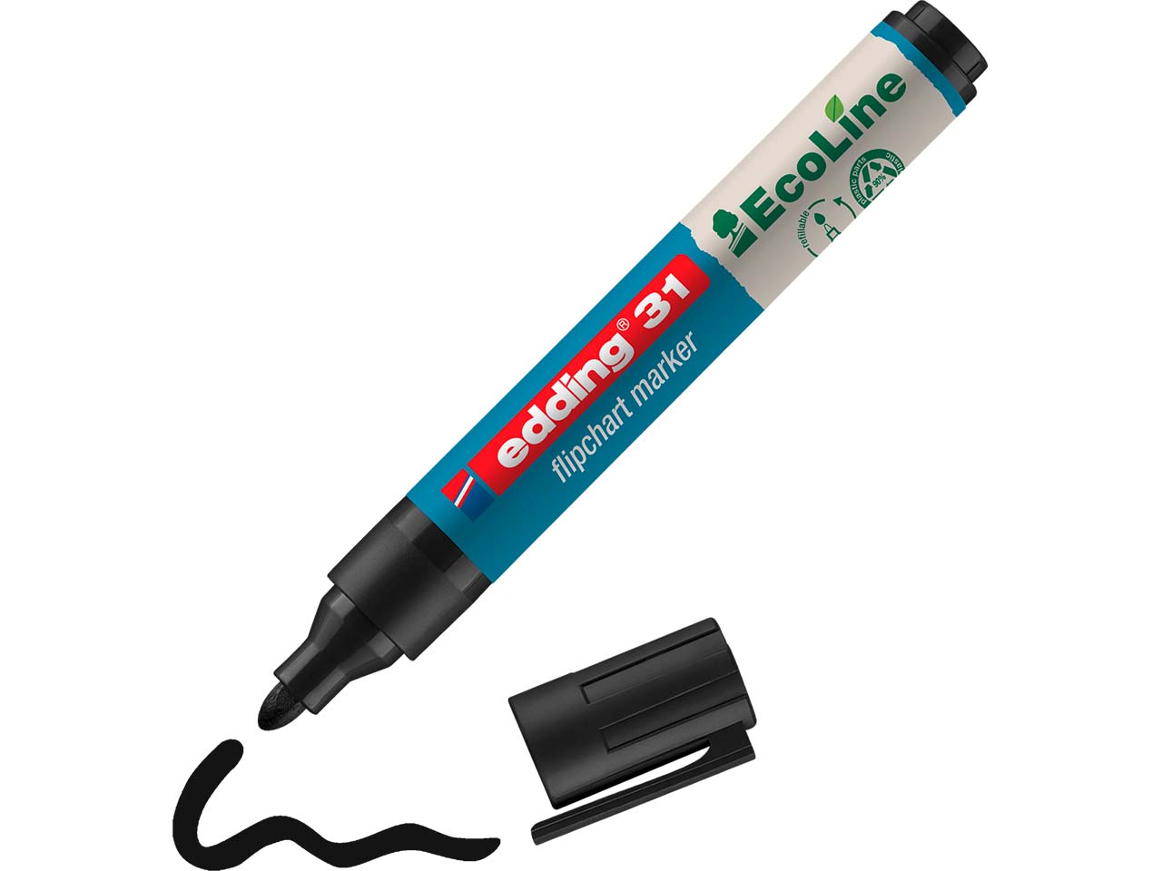 Der geruchsneutrale edding Flipchart-Marker "EcoLine 31" ist bei Präsentationen unersetzlich. Die wasserbasierte Tinte schlägt beim Schreiben auf Flipchart-Papier, Moderationspapier oder Moderationskarten nicht durch. Die Kunststoffteile bestehen zu mindestens 90 % aus recyceltem Material. Der Marker lässt sich nachfüllen, die Rundspitze ist austauschbar. Strichstärke 1,5-3 mm.