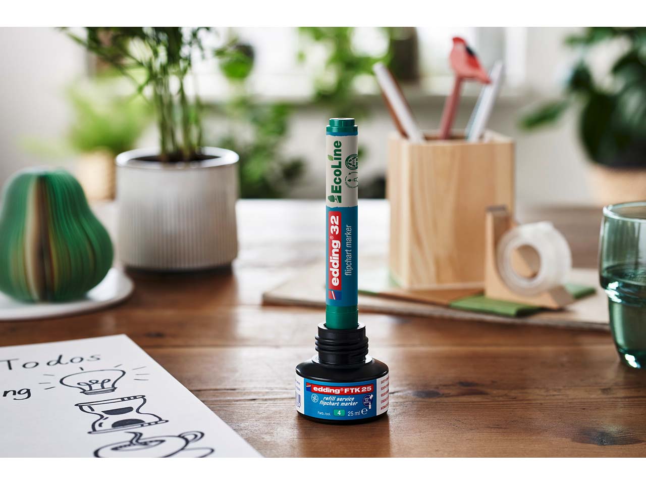 Der edding Flipchart-Marker "EcoLine 32" ist bei Präsentationen unersetzlich. Die wasserbasierte Tinte schlägt beim Schreiben auf Flipchart-Papier, Moderationspapier oder Moderationskarten nicht durch. Zudem ist der edding geruchsneutral. Der Stift kann nachgefüllt werden, außerdem ist die Keilspitze austauschbar.