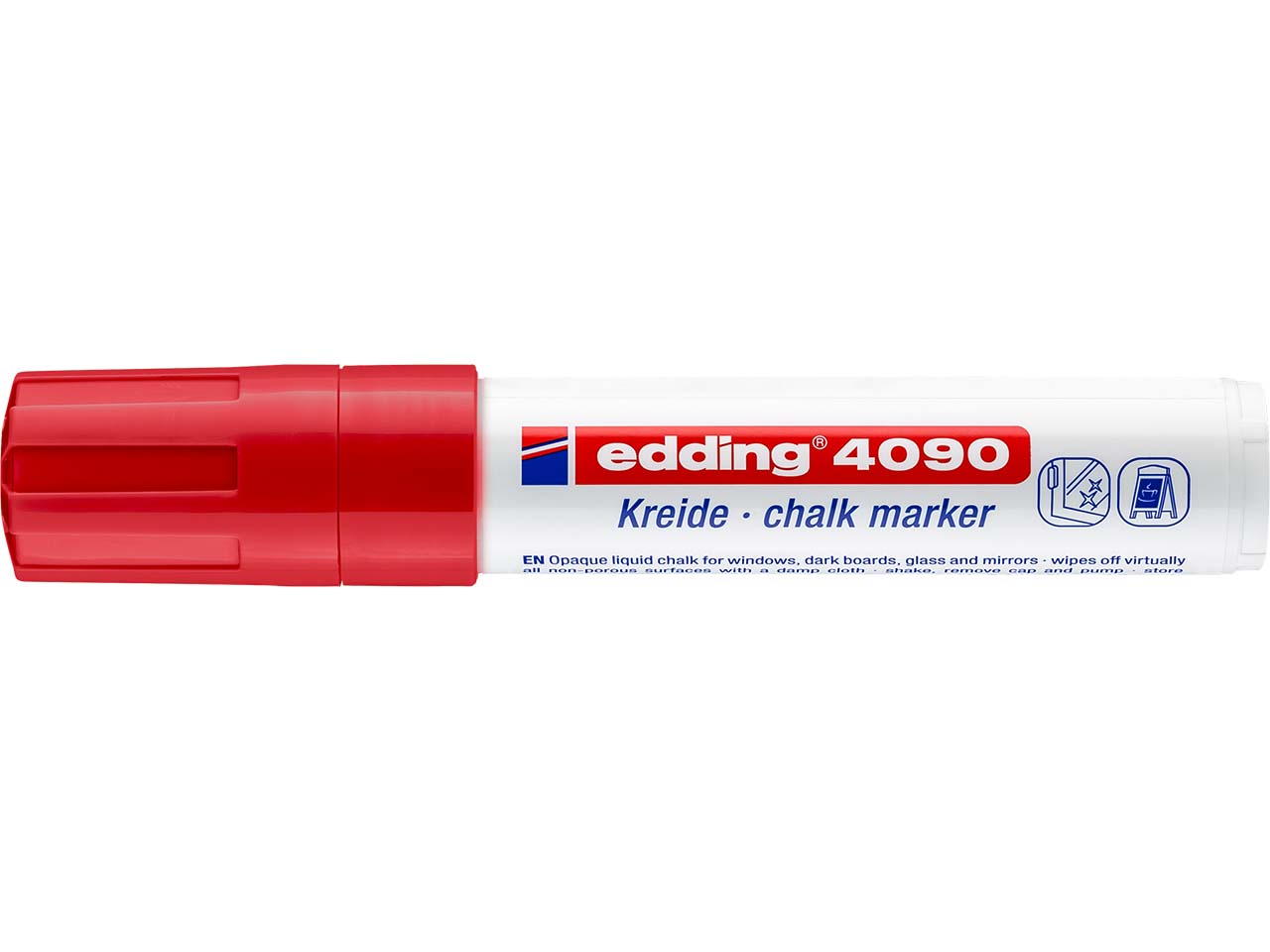 Der edding Window Marker "4090" eignet sich hervorragend wenn es darum geht, auffällige Markierungen oder Bemalungen anzufertigen. Die Flüssigtinte trocknet schnell und riecht nicht. Sie kommt vor allem auf Glas, Fenstern und Tafelaufstellern gut zur Geltung.