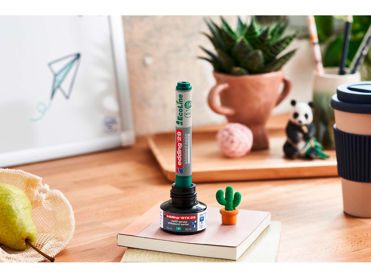 Die Nachfülltusche BTK 25 ist denkbar einfach zu bedienen: Der leere edding Boardmarker muss einfach nur kopfüber und ohne Kappe für mindestens eine Stunde in die Flasche gesteckt werden. Geruchsarme Farbe. 1 Flasche = 25 ml. Farbe grün.