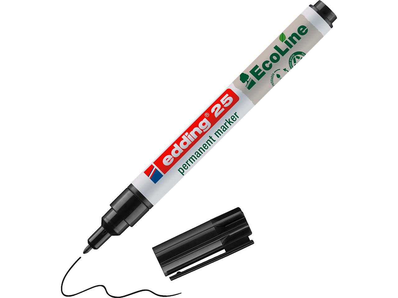 Mit den Permanent-Markern der edding EcoLine-Serie lassen sich fast alle Materialien beschriften, kennzeichnen oder markieren. Darunter fallen beispielsweise Glas, Kunststoff, Karton, Papier oder Metall. Die Permanent-Marker enthalten geruchsarme Tinte, die zudem wasserfest und abriebbeständig ist. Die Strichstärke der Markerspitze beträgt 1 mm und es sind Ersatzspitzen verfügbar. Zu 90 % sind die Schäfte, Spitzen und Kappen der Marker aus recyceltem Material hergestellt.