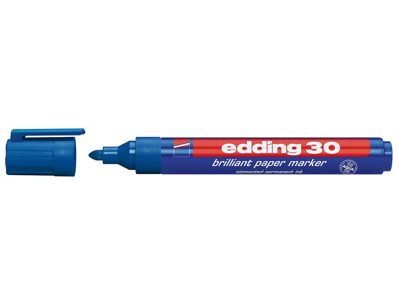 Mit dem edding Pigmentmarker "30" beschriften Sie Papier und Karton. Die geruchsneutrale Pigmenttinte ist auf Wasserbasis hergestellt und schlägt nicht durch das Papier. Sie ist wasser-, wisch- und abriebfest. Nachfüllbar und mit praktischem Clip. Die Rundspitze des Markers hat eine Strichstärke von 1,5-3 mm. Farbe blau.