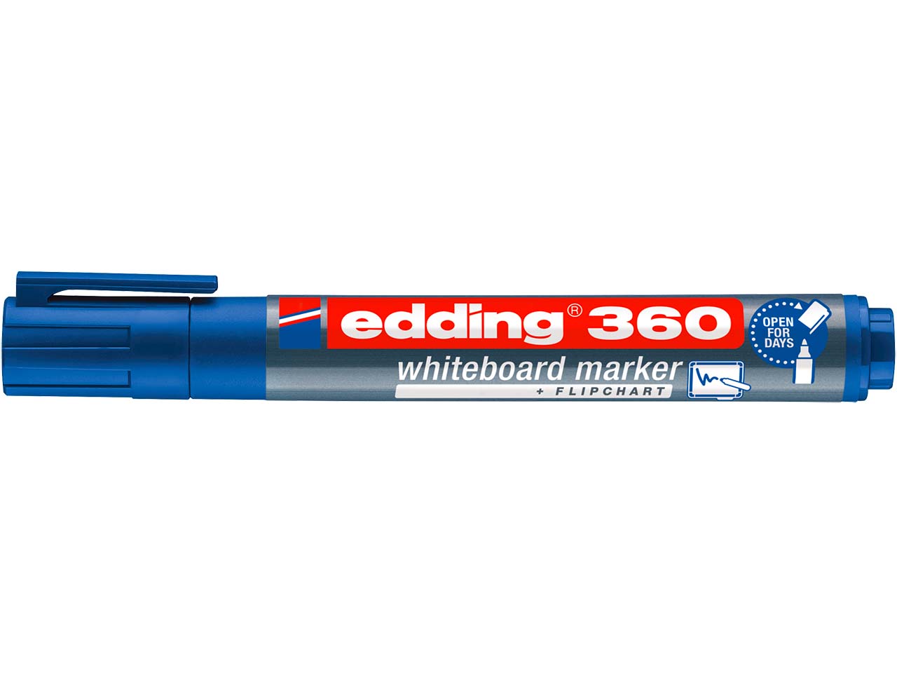 Der Boardmarker "360" von edding mit Rundspitze ist ideal für das Schreiben auf dem Whiteboard. Die Tusche ist geruchsarm und trocken abwischbar von vielen Oberflächen wie Glas, Melamin oder Emaille. Cap-off-Zeit: bis zu einigen Tagen. Der Whiteboard-Boardmarker ist nachfüllbar. Strichstärke 1,5-3 mm. 1 Pack. = 4 Stifte. Farbe blau.