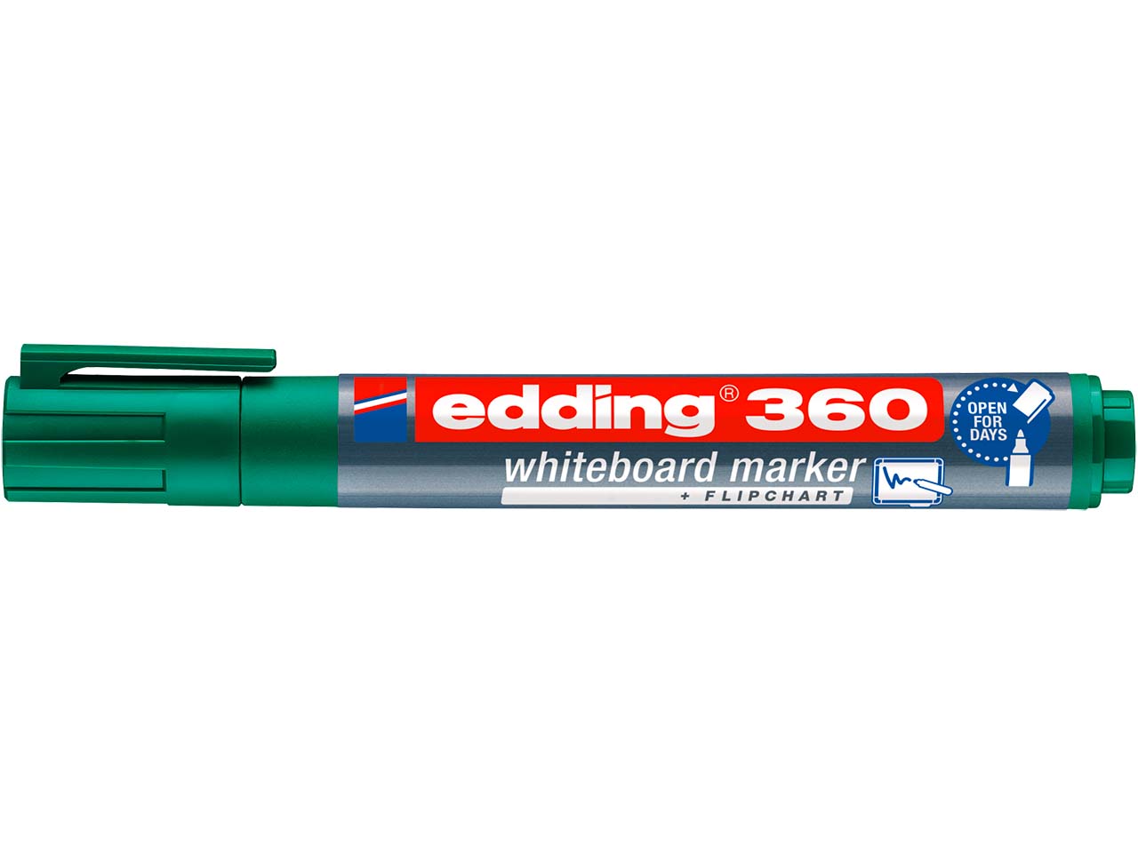 Der Boardmarker "360" von edding mit Rundspitze ist ideal für das Schreiben auf dem Whiteboard. Die Tusche ist geruchsarm und trocken abwischbar von vielen Oberflächen wie Glas, Melamin oder Emaille. Cap-off-Zeit: bis zu einigen Tagen. Der Whiteboard-Boardmarker ist nachfüllbar. Strichstärke 1,5-3 mm. 1 Pack. = 4 Stifte. Farbe grün.