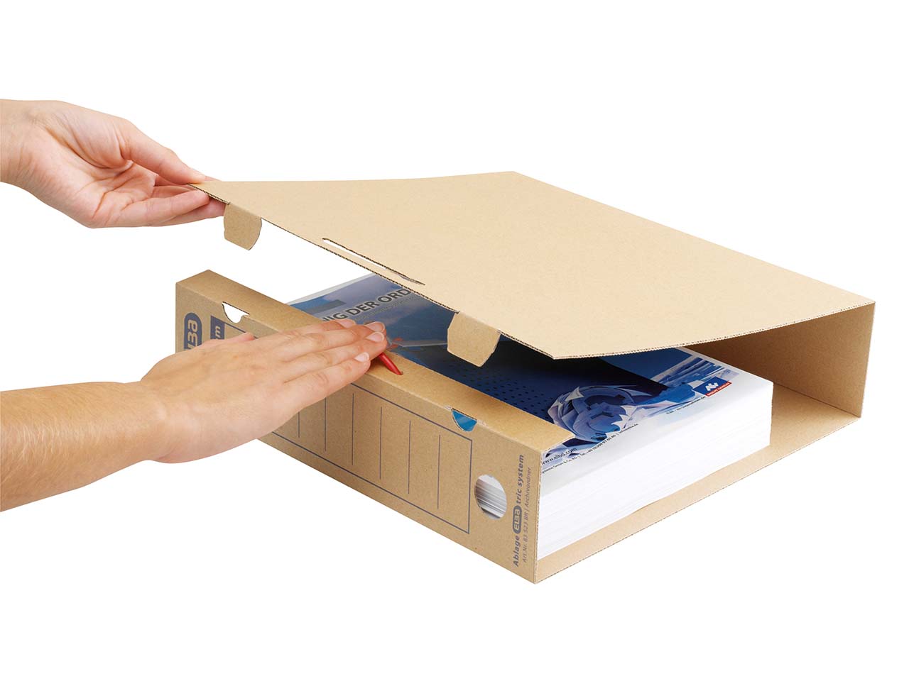 Ideal für die Ablage von DIN A4-Dokumenten mit ELBA Bündelungsbügel (nicht im Lieferumfang): Dieser Archivordner überzeugt mit exzellent nachhaltiger Qualität aus extrem stabiler Wellpappe aus Recyclingkarton und ist sehr praktisch. Zum platzsparenden Archivieren ist der seitliche offene Ordner stapelbar. Ordnerfüllungen sind in der cleveren Box mit Verschlusslasche ordentlich verstaut und der Ordner selbst kann wieder verwendet werden. Durch den Archivaufdruck ist eine Beschriftung sehr einfach. Mit dem Griffloch ist der Ordner schnell aus Schrank oder Regal gezogen. Der Archivordner bietet Platz für rund 500 Blatt DIN A4. B 7,8 x T 28,8 x H 31,4 cm.