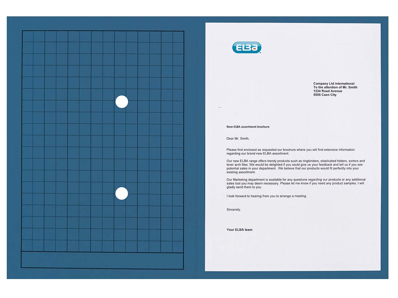 Stabile Umlaufmappe mit Gitterdruck innen und außen sowie durchgehenden Schaulöchern. Aus Karton in 250 g/m²-Qualität und mit gerundeten Ecken. Für Format DIN A4, Füllhöhe ca. 1 cm für 100 Blatt (80 g/m²). B 23 x T 31,8 cm. Farbe blau.