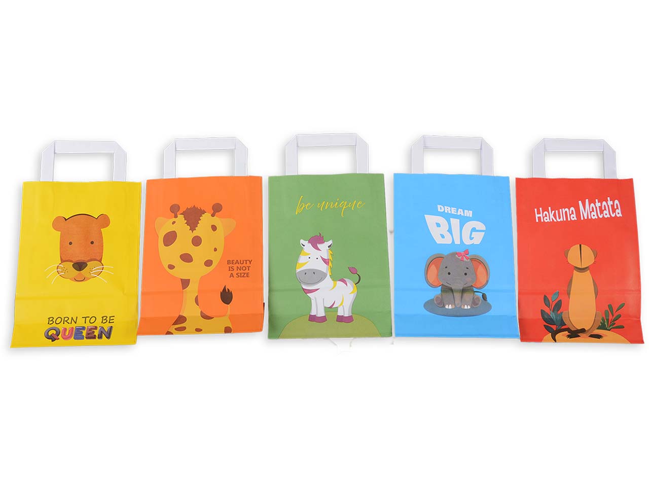 Die Safari geht los! Mit dabei sind Elefant, Löwe, Giraffe, Zebra und Erdmännchen. Die Recyclingpapier-Tragetaschen in FSC-zertifizierter Qualität sind mit ihrem farbenfrohen, tierischen Design perfekt für Geburtstagsfeiern, als Geschenkverpackung oder zur Aufbewahrung von Kleinigkeiten. Dank Flachhenkeln lassen sie sich einfach tragen.