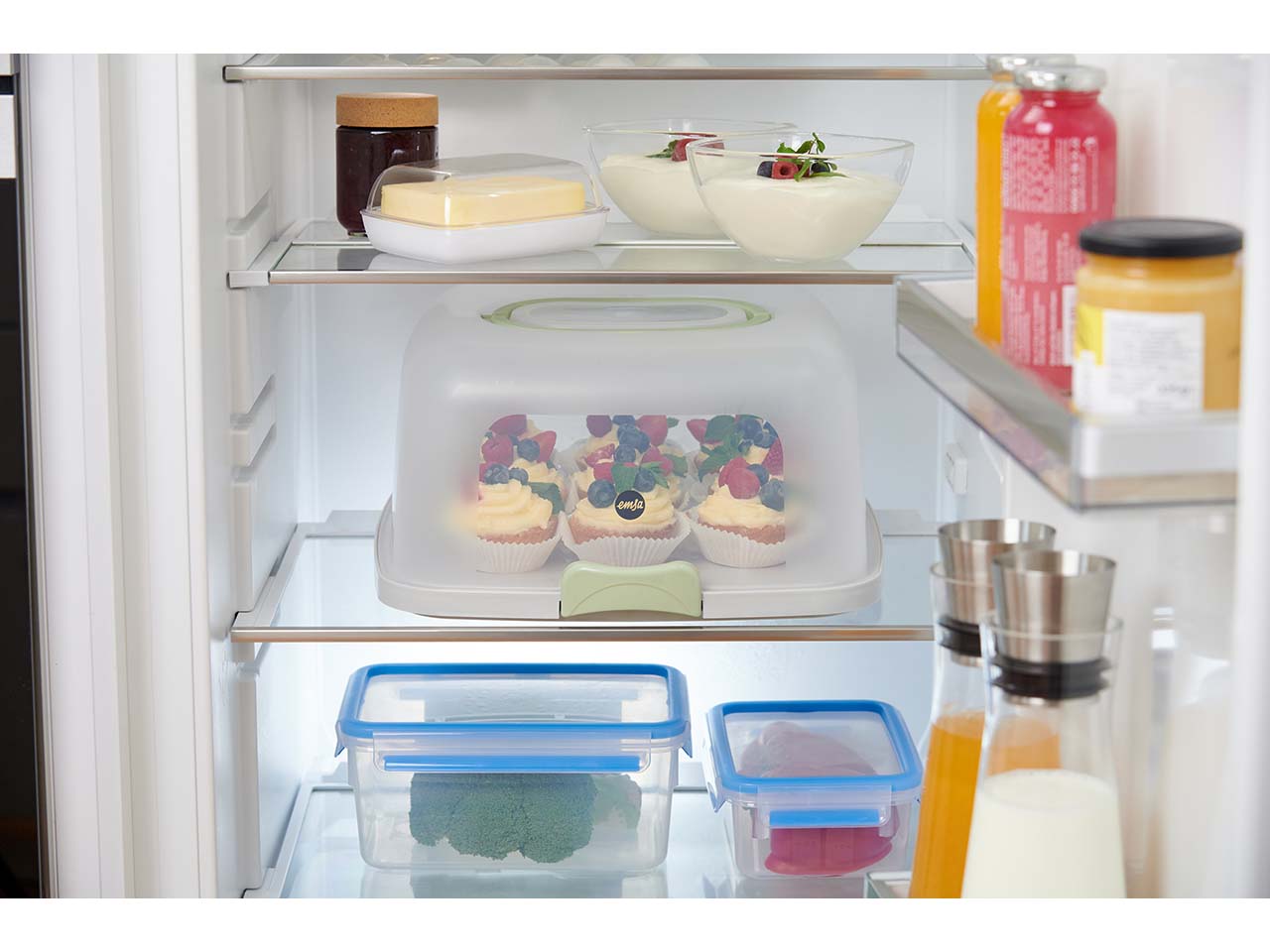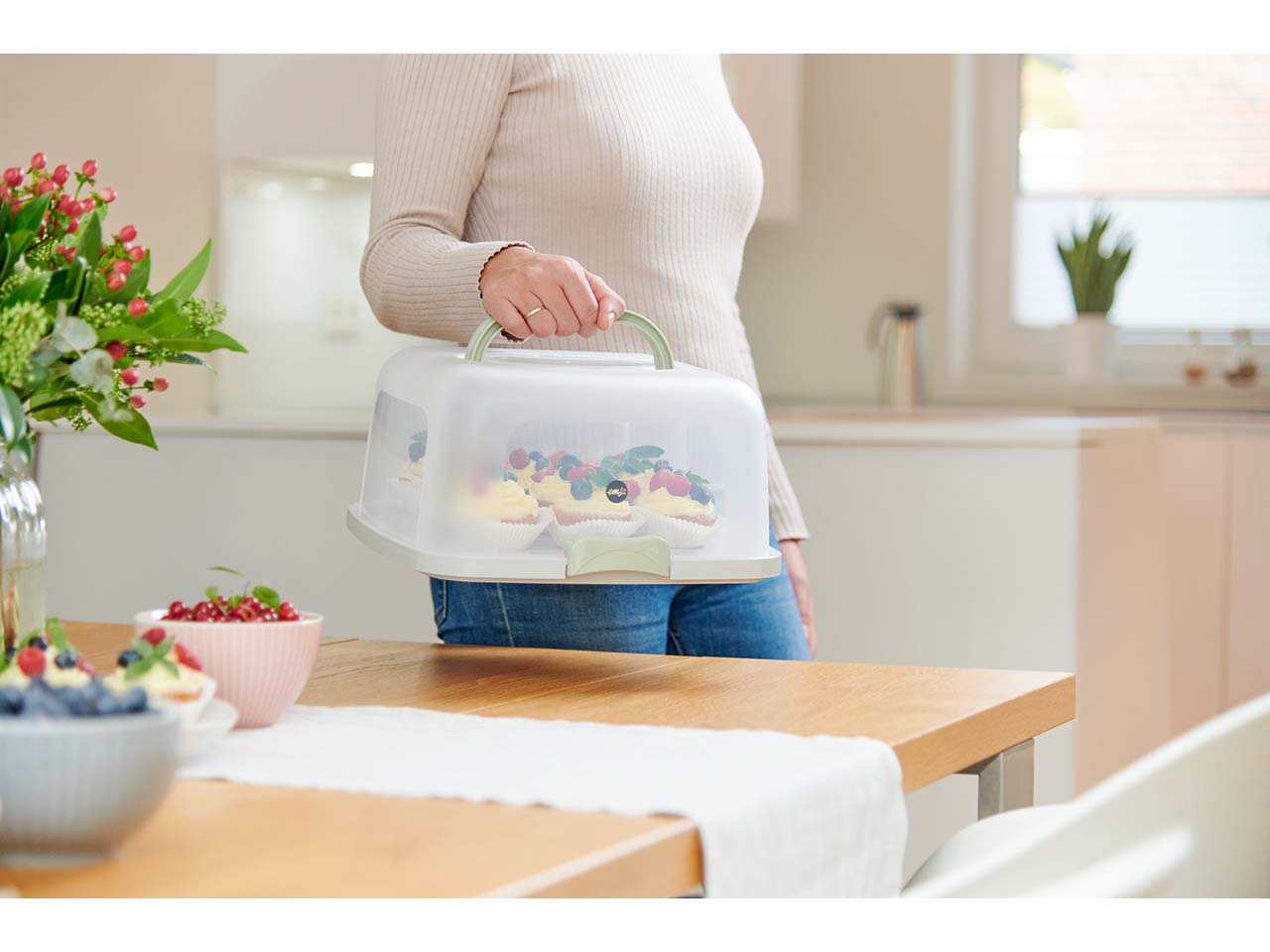 Kuchen, Torten und Co. sind in dieser Kuchenaufbewahrungsbox von EMSA bestens untergebracht! Die rechteckige Form bietet viel Platz für allerlei Kreationen. Dank der integrierten Griffe gestaltet sich der Transport kinderleicht. Die Kuchenglocke kann auch benutzt werden, um Gebäck, etc. im Kühlschrank aufzubewahren. Gefertigt ist die Box aus hochwertigem, langlebigem Kunststoff. Zwei Clips verbinden Deckel und Boden zuverlässig. Am Boden ist eine praktische Schneidevorrichtung angebracht, wodurch sich Kuchen und Torten perfekt in gleich große Stücke schneiden lassen. B 33 x T 37 cm.