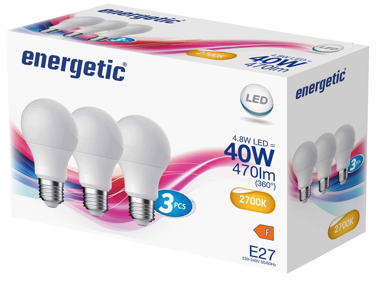 energetic LED-Lampe, 3er-Pack, A60, 4,8 W, E27, 470 lm, 2.700 K