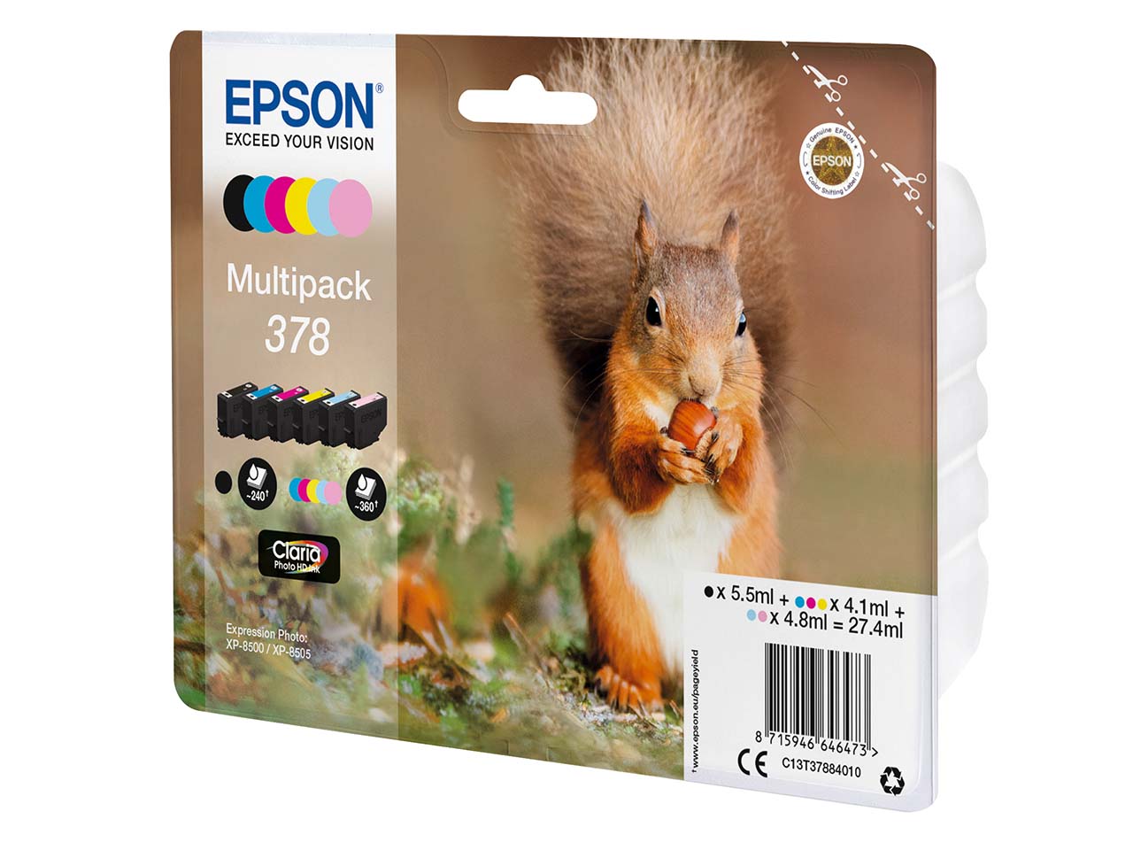 Die 6 originalen Epson Tintenpatronen 378 (Herstellernummer C13T37884010) erzielen exzellente Druckergebnisse. Sie passen für Expression Photo XP-8000, 8005, 8500 und 8505 sowie für Expression Photo HD XP-15000. Bei 5 % Deckung bzw. Schwärzung sind 5 x 360 und 1 x 240 Ausdrucke möglich. 1 Set = 6 Tintenpatronen.
