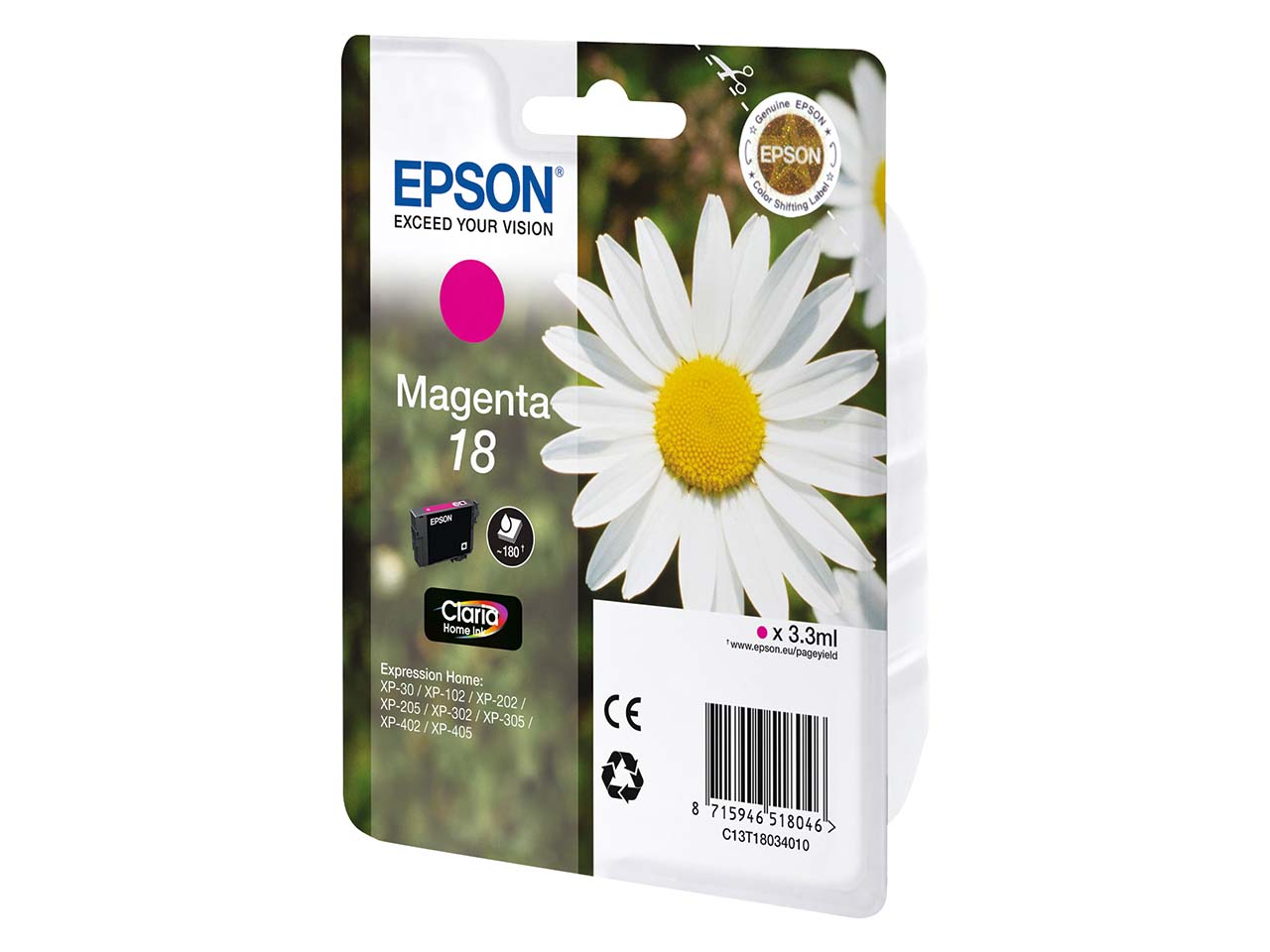 Die originale Epson Tintenpatrone T1803/18 erzielt beim Druck von Texten, Bildern und Grafiken optimale Ergebnisse. Die Patrone ist passend für verschiedene Modelle des WorkForce Expression Home und reicht bei 5 % Deckung für ca. 180 Seiten. Farbe magenta.