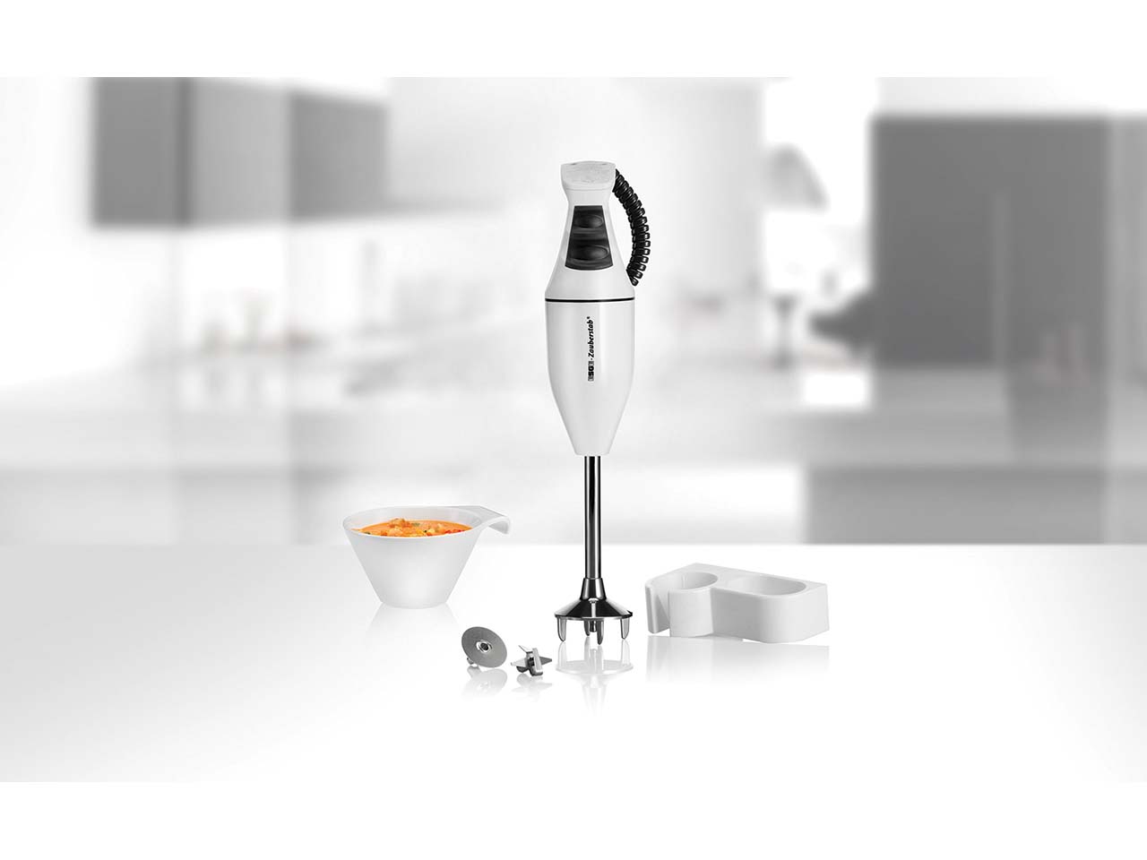 Stabmixer, Multimesser, Schlagscheibe, Wandhalter, Bedienungsanleitung mit Rezepten |