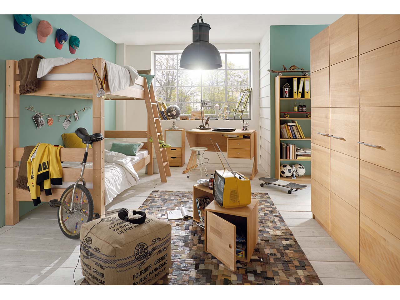 Das Etagenbett ist die unkomplizierte, platzsparende Lösung, um zwei Betten aufzustellen. Es zeichnet sich durch hervorragende, stabile Qualität aus, die durch die Herstellung aus massivem, FSC-zertifiziertem Holz entsteht. Zur Auswahl stehen Kiefern- und Buchenholz. Das Bett verfügt über zwei Rollroste und eine Absturzsicherung am oberen Bett. Dieses wird über die Schrägleiter erreicht, die rechts oder links angebracht werden kann. Das Hochbett kann auch als zwei einzelne Betten genutzt werden, was besonders praktisch ist, wenn Kinder noch nicht die Leiter nutzen können. B 135 x T 210 x H 169 cm.